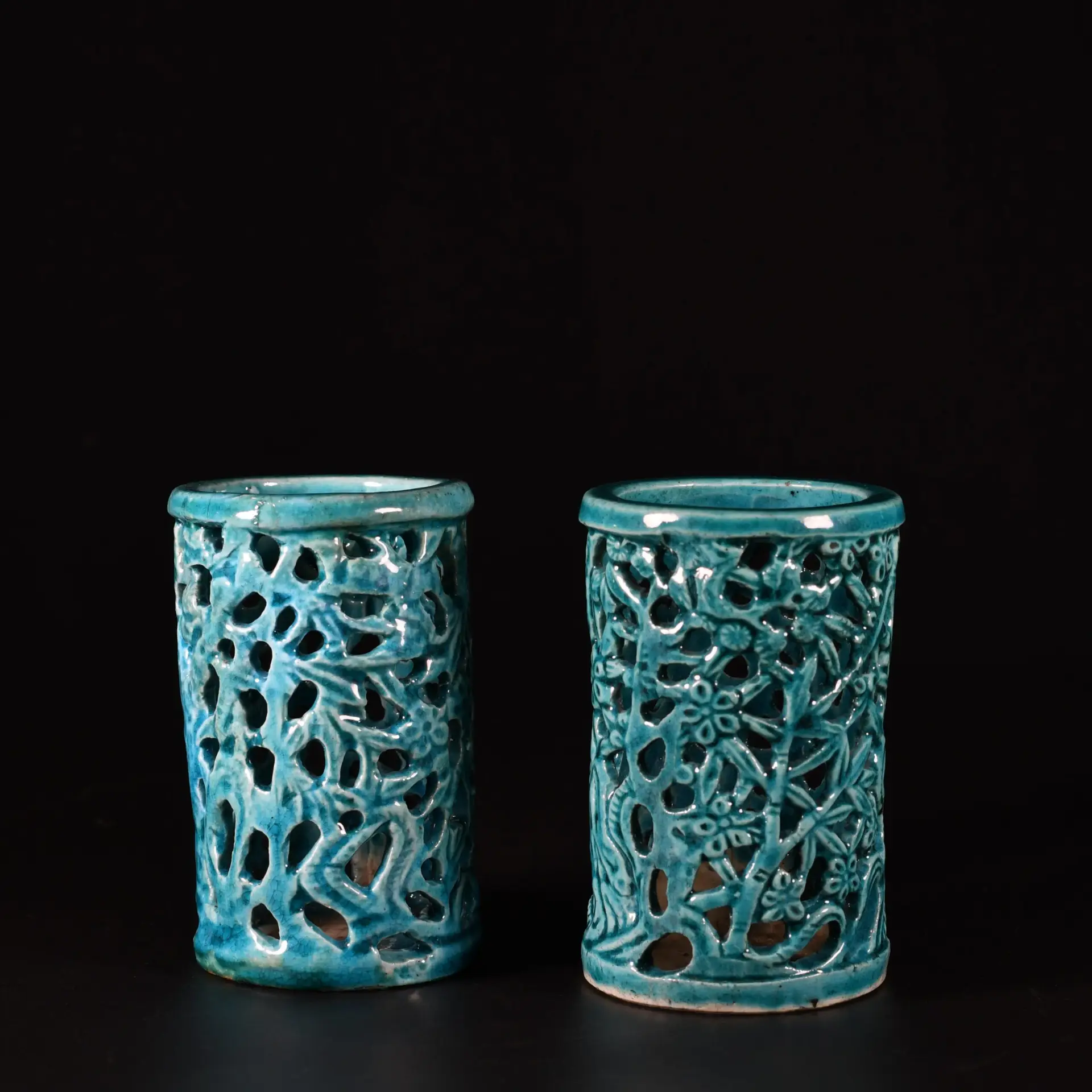 A set of two turquoise‑glazed porcelain brushpots, pierced/openwork decoration with prunus, bamboo, and pine — “The Three Friends of Winter.”