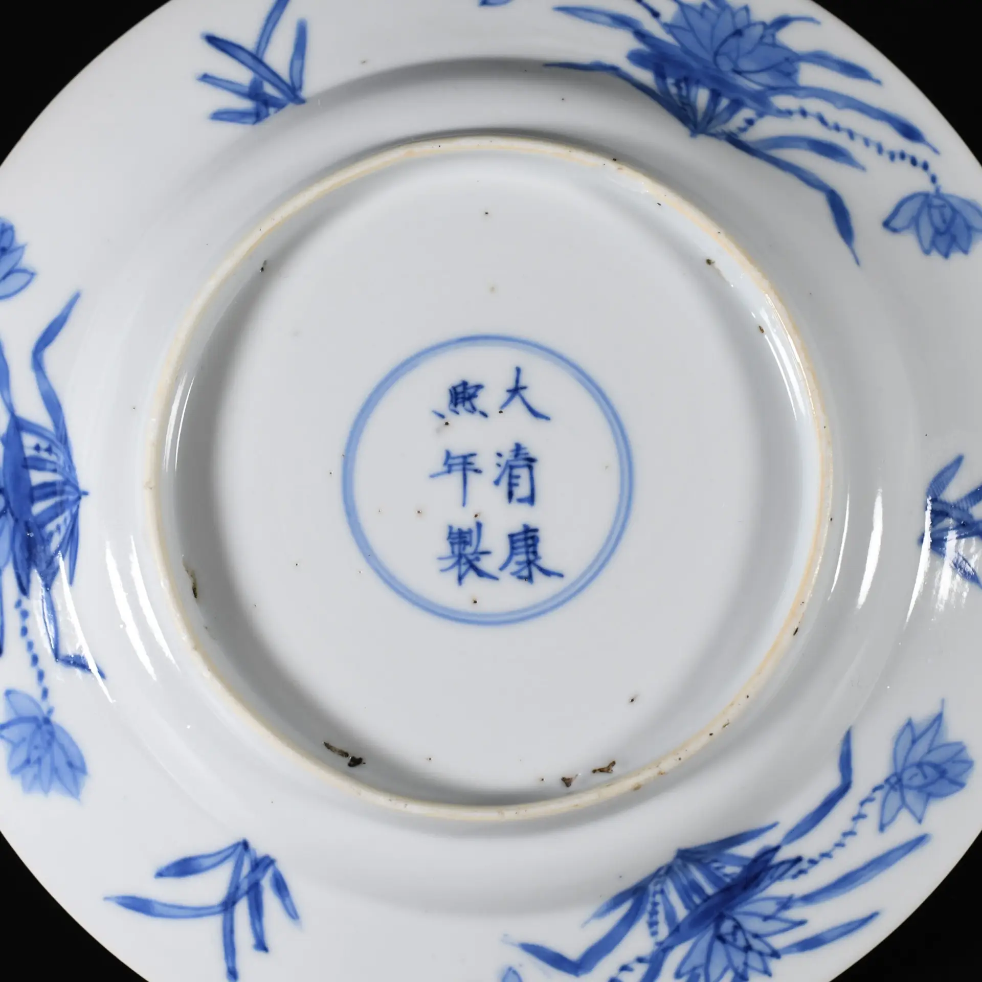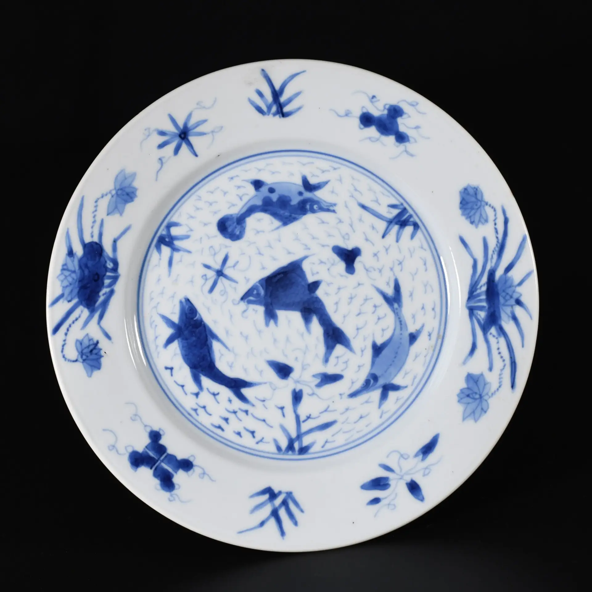 A porcelain plate decorated in blue and white with fish and lotus flowers along the border.The reverse bears a six-character Kangxi mark.