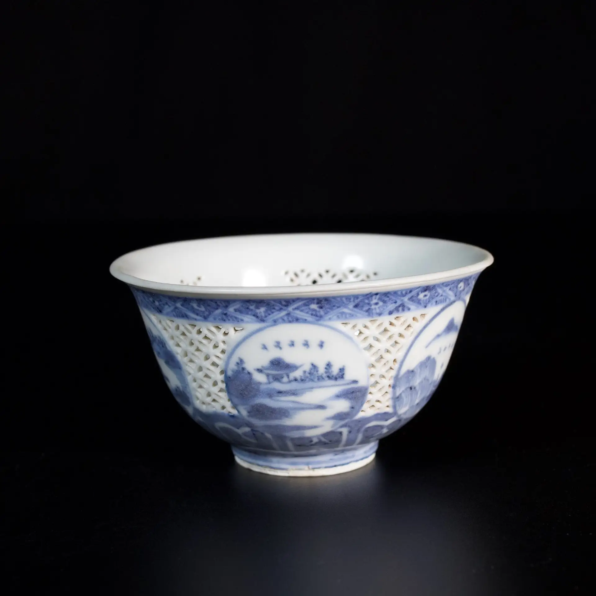 A porcelain bowl with reticulated sides, decorated with five medallions containing underglaze blue pagodas. The medallions are surrounded by two decorative bands.