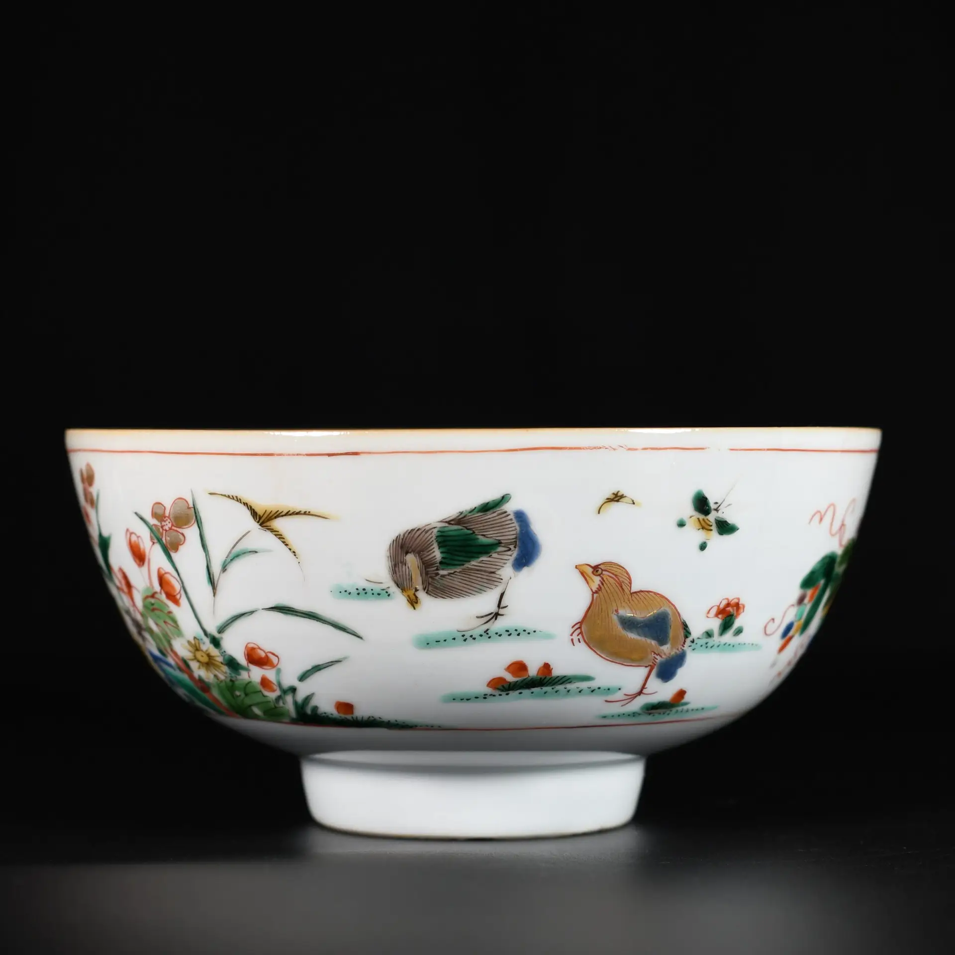 A rare Famille Verte porcelain bowl decorated with two squirrels among vine leaves, and two quails surrounded by flowers. The interior of the bowl is decorated at the center with a flower. The inner rim, characteristic of the Kangxi period, features four floral panels on a background of flowers and motifs.