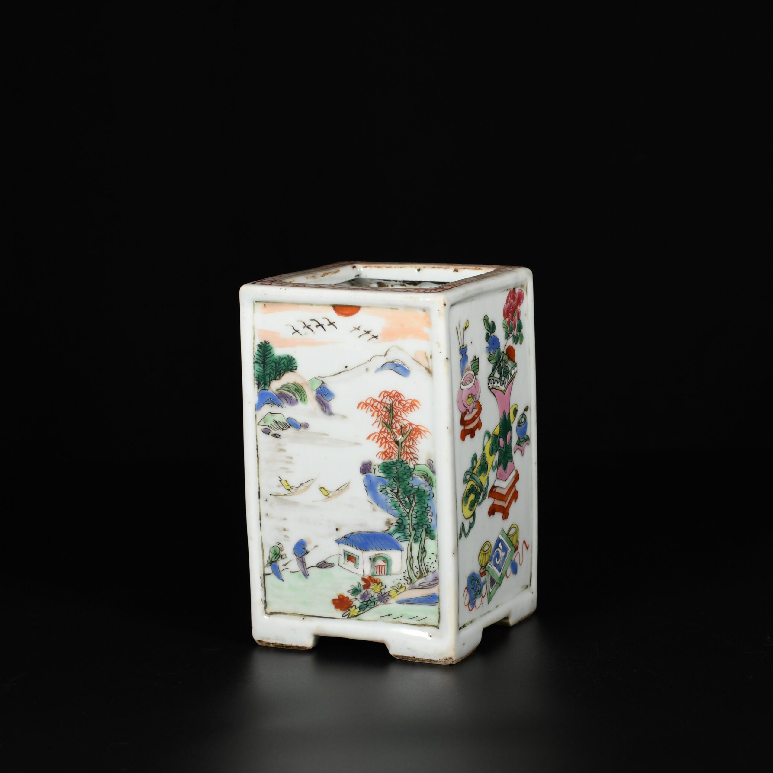 A Famille Rose porcelain brushpot, or bitong, of quadrangular shape. Each side is painted with lacustrine landscapes alternating with a design of precious objects, or the “Hundred Antiques”.