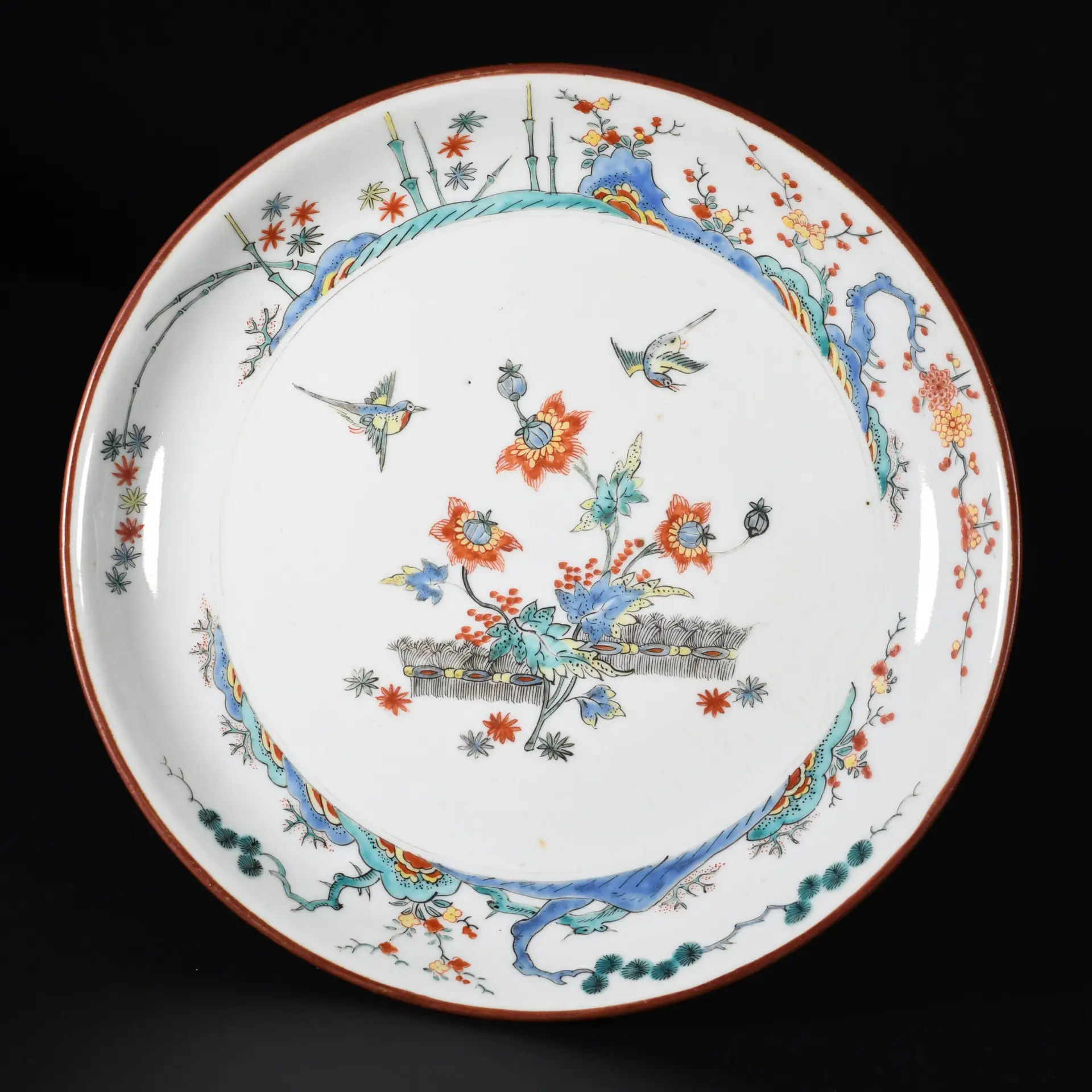 A porcelain saucer with Kakiemon style decoration, decorated in the Netherlands.