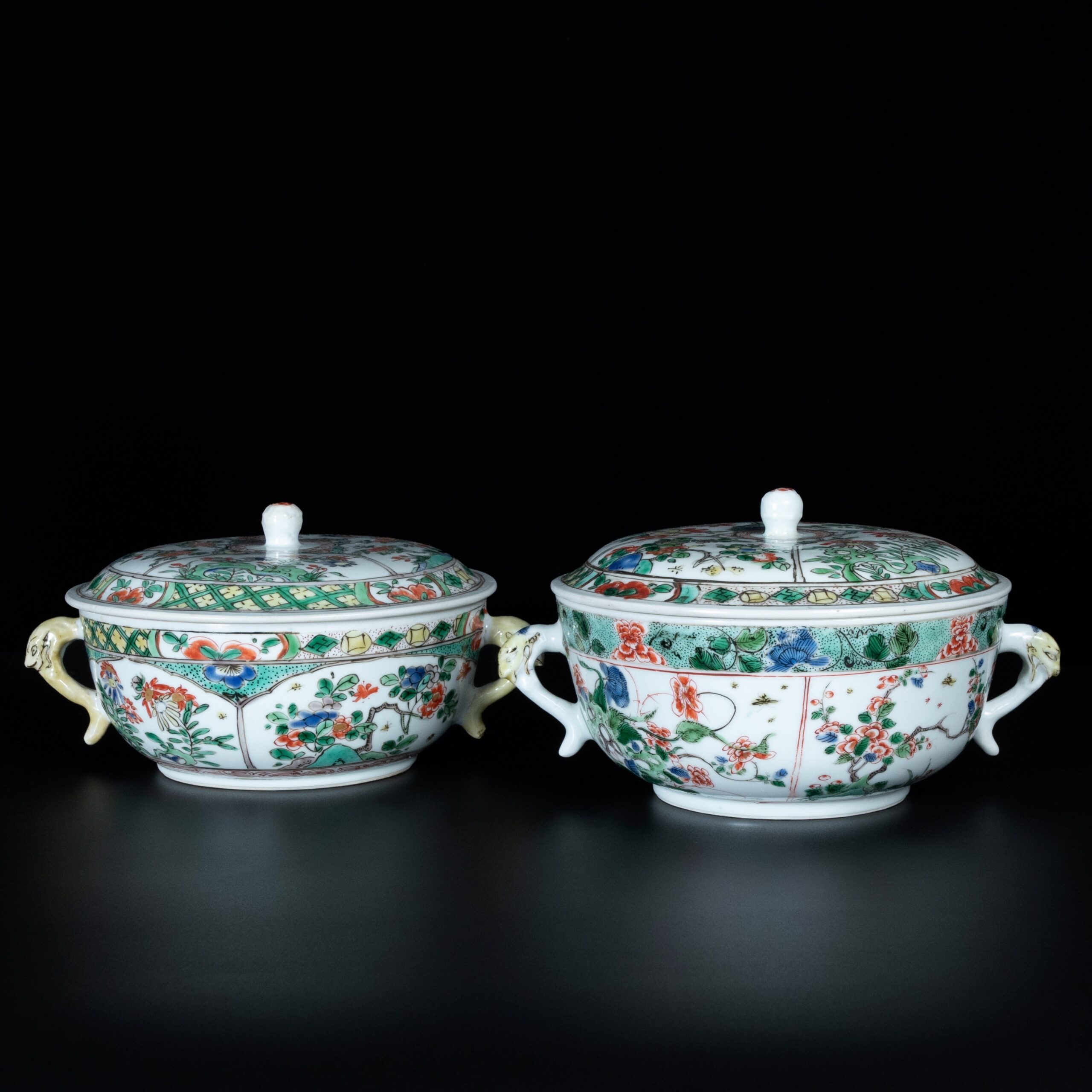 Two Famille Verte covered ecuelles with chimera-head handles.