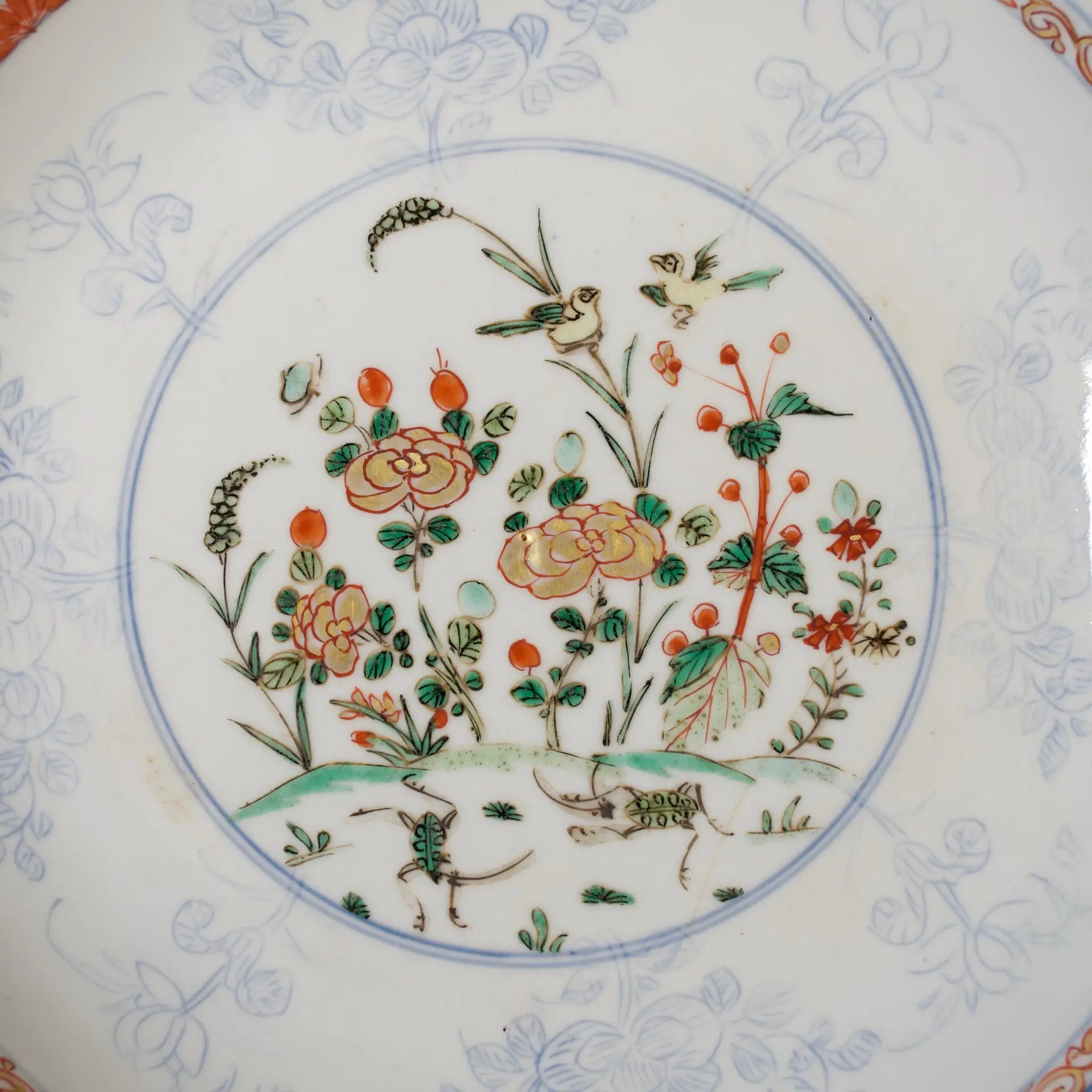 A pair of porcelain Famille Verte and underglaze blue saucers. The central medallion depicts birds and insects amid flowers, encircled by a double blue line from which additional floral motifs radiate. The rim is ornamented with flowers in Famille Verte enamels, accented with gilt and red enamels.