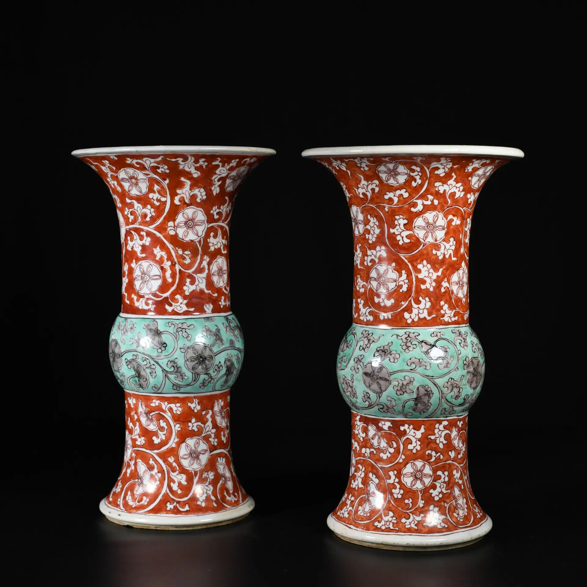 A pair of Gu‑shaped vases with iron‑red floral scroll decoration; the central section is decorated with the same motif in aubergine on a green ground.