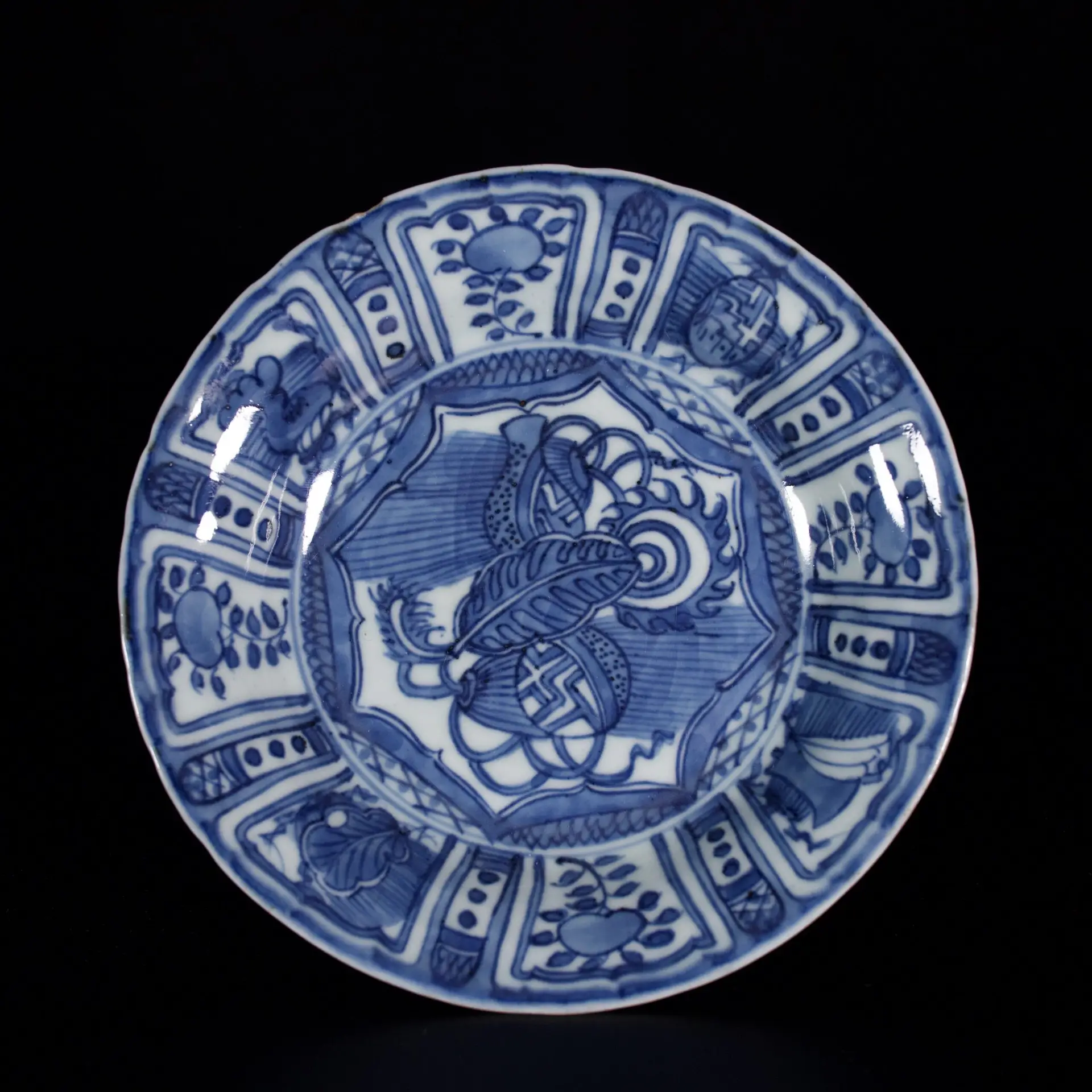 Small “Kraak” Blue-and-White flared dish decorated with a double‑gourd motif and tobacco‑leaf foliage. The rim is ornamented with symbols and flowers. The gourd is said to represent the gourd of the poet (or sage) Li Bai.