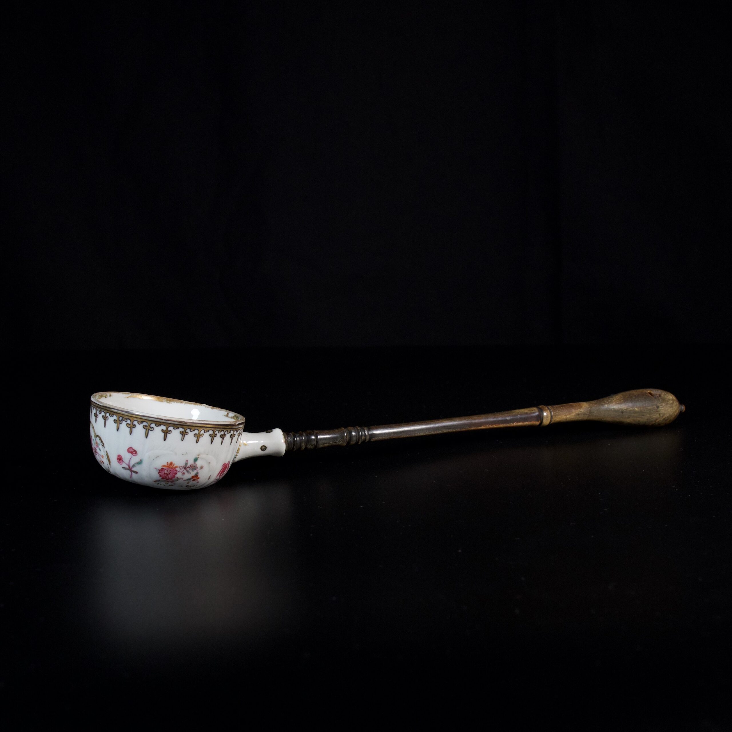 A circular porcelain famille rose punch ladle and an ebony wood handle. The porcelain is decorated with floral motifs and a gilded lanceolate border. The interior of the ladle is embellished with a flower, and the inner rim features a gilt frieze. The handle is turned ebony wood.