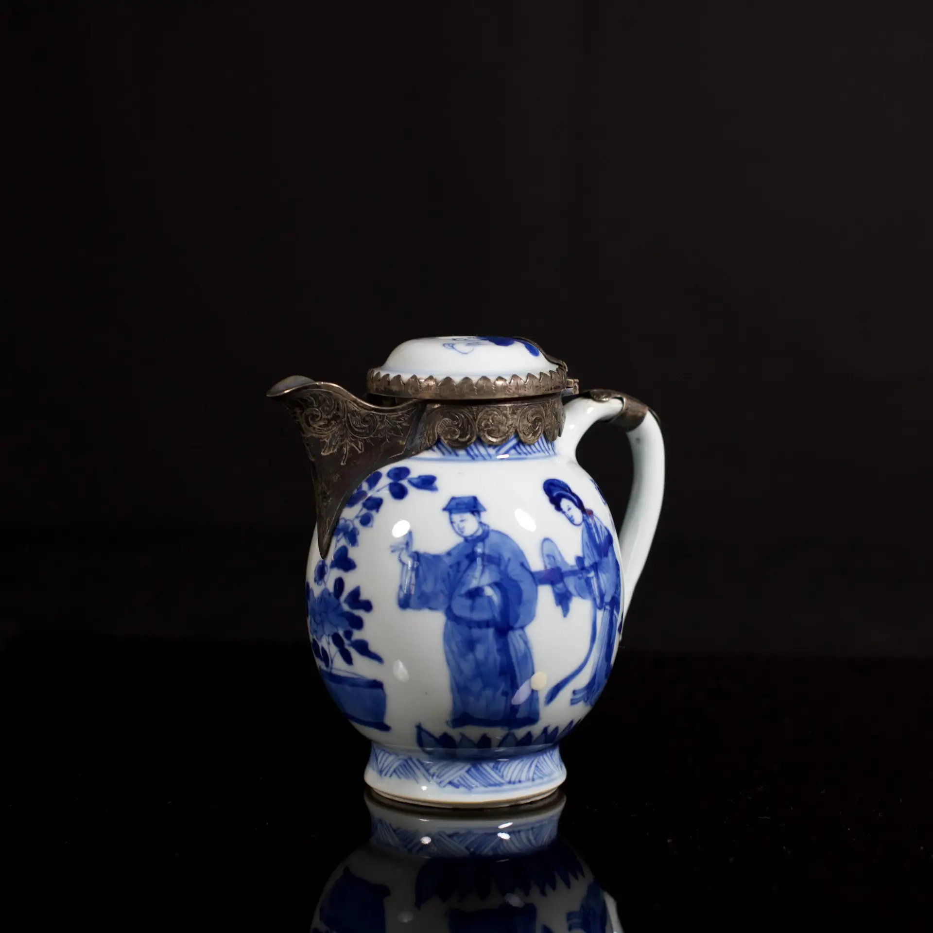 Blue-and-White porcelain milk jug with figural decoration, and a matching floral‑decorated pot. The cover of the pot is decorated with children playing; the handle is adorned with flowers. The piece has a silver mount.