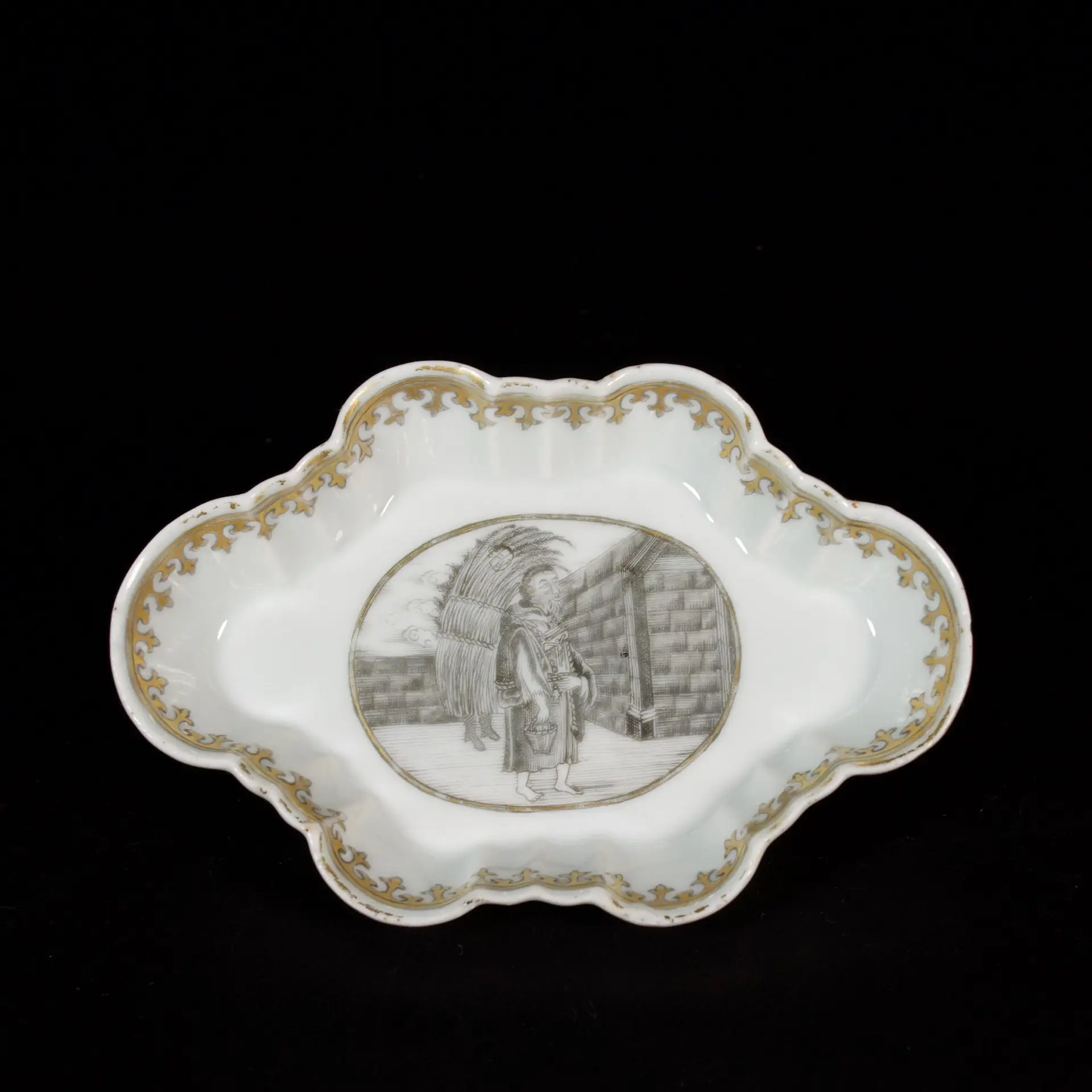 A porcelain bowl with a grisaille decoration depicting a religious subject: a missionary carrying a sheaf of wheat as he passes through the gate of a monastery. A child can be seen within the sheaf of wheat.