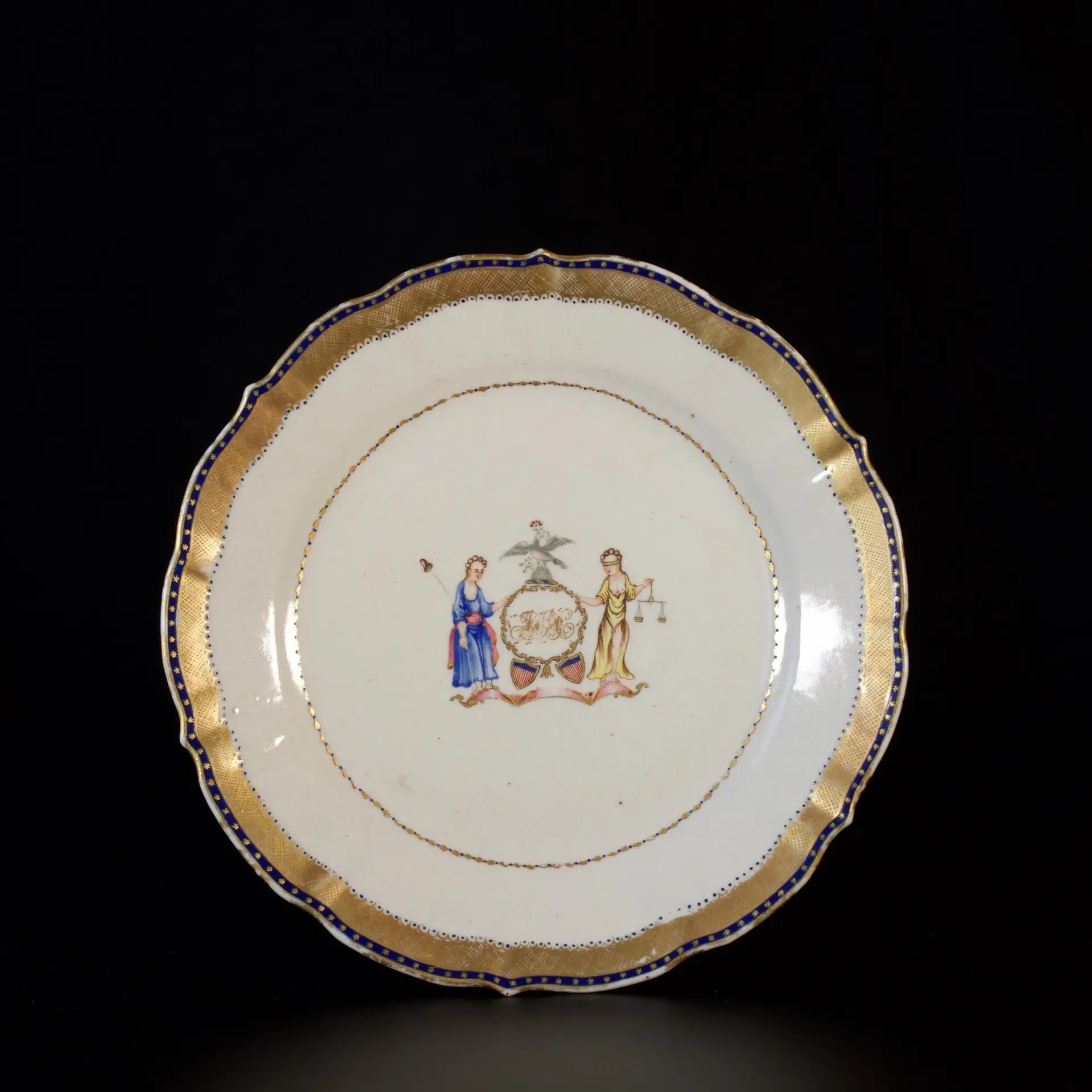 A lobed porcelain plate with a central decoration of the State of New York arms, featuring the allegories of Justice and Liberty flanking the coat of arms, surmounted by an eagle.