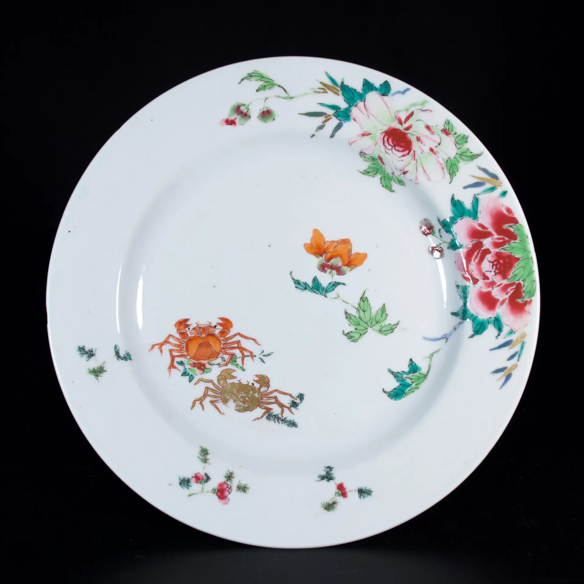 Rare porcelain plate in Famille Rose enamels, decorated with two orange-and‑gold crabs, the decoration broadened with flowers.