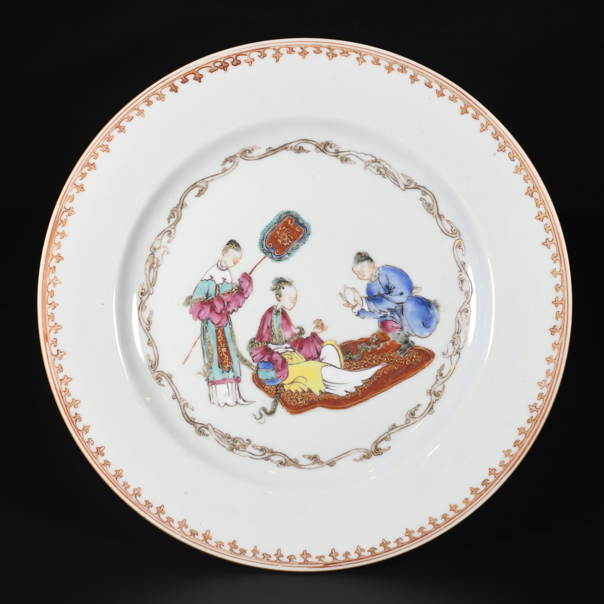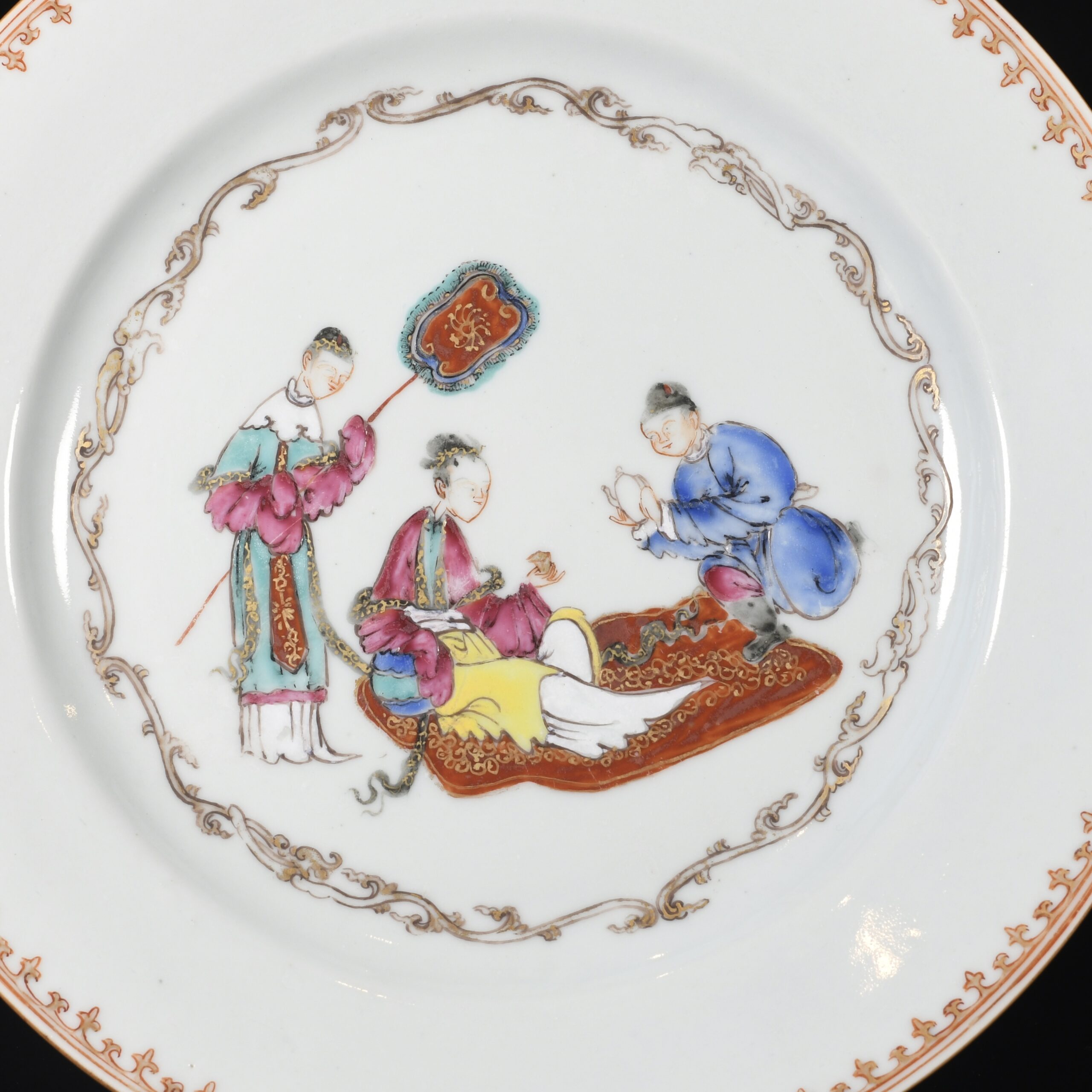 A porcelain plate with a central scene depicting a woman attended by her servants. The composition shows, at its centre, a woman accompanied by two attendants: one kneeling to serve her tea, the other fanning her.