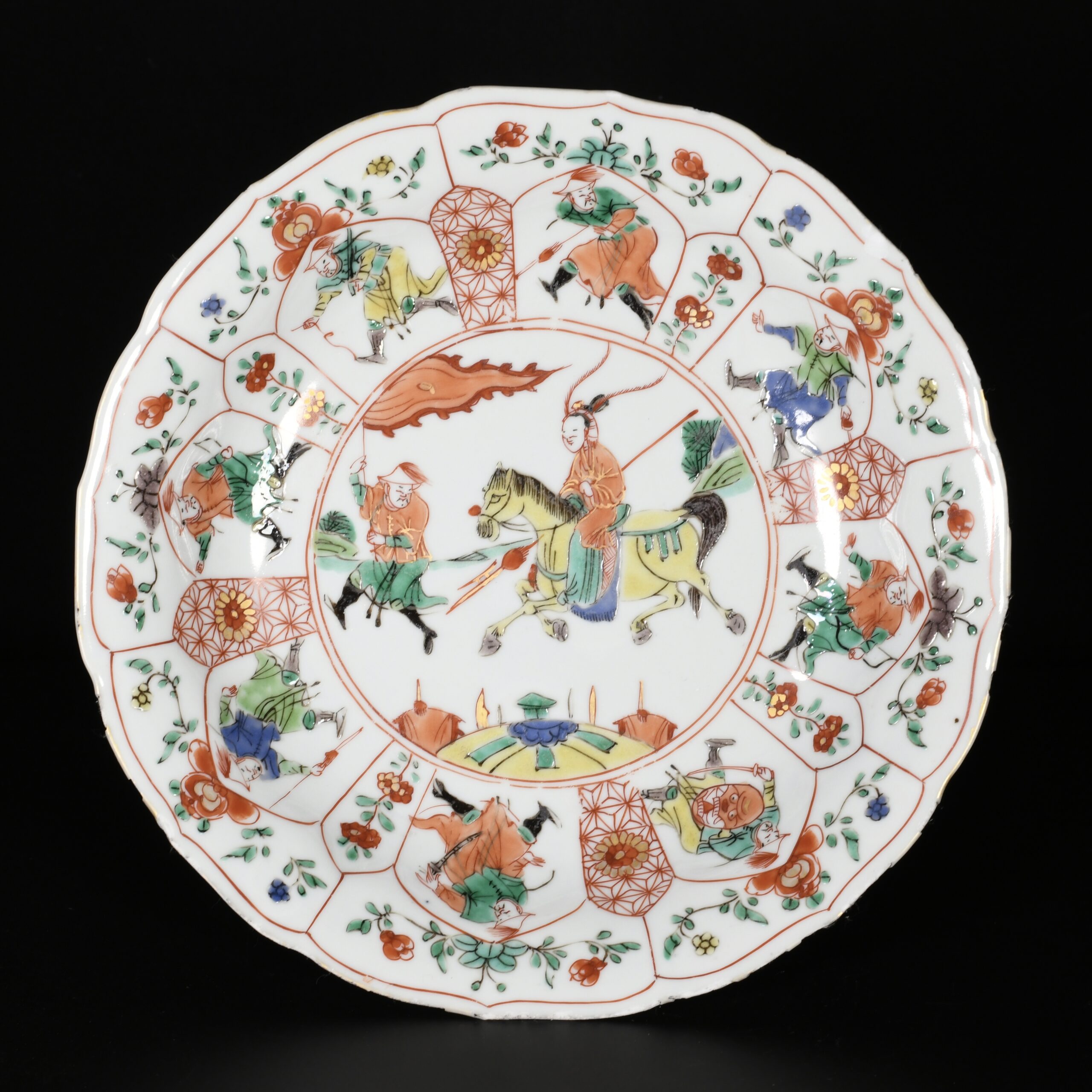 A lotus‑shaped porcelain plate decorated with Famille Verte enamels and iron‑red decoration, depicting Mu Guiying and a standard‑bearer. The border is adorned with soldiers alternating with floral motifs.
