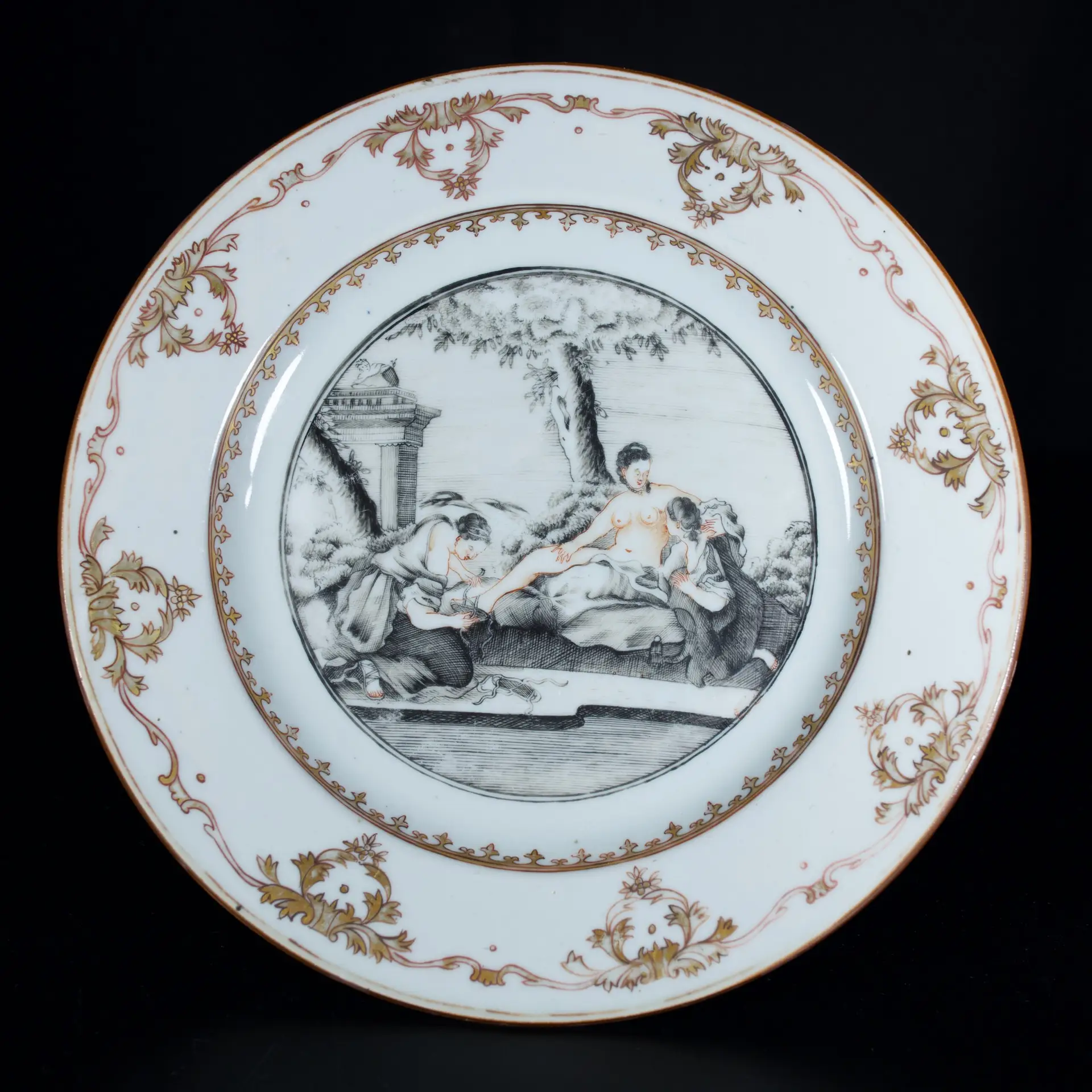 A porcelain plate with a central grisaille decoration depicting David walking on the terraces of his palace and seeing Bathsheba bathing.