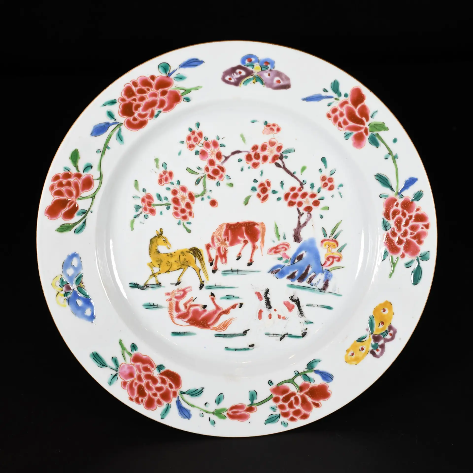 A Famille Rose enamelled porcelain plate with a decoration of Mu Wang’s horses. Four horses in pink, yellow, and white enamels, speckled with pink, stand near a flowering tree. The border is decorated with peonies alternating with three butterflies and lingzhi flowers.