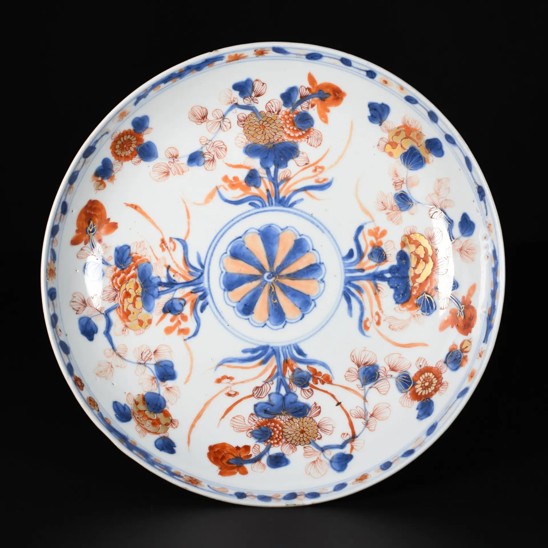 A porcelain saucer with an Imari floral decoration, arranged symmetrically around a central flower.