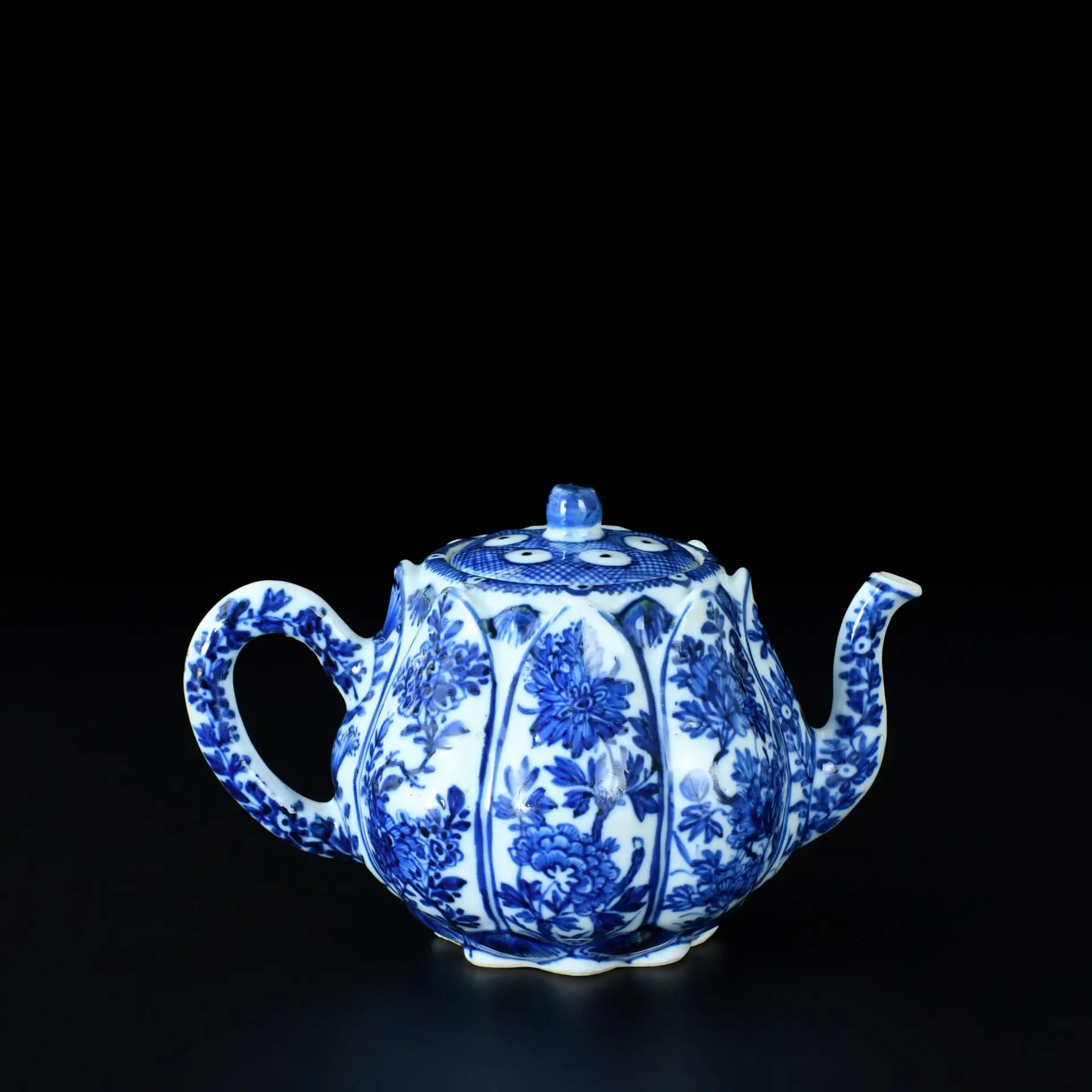 A lotus bud-shaped teapot, decorated in underglaze blue with floral motifs.