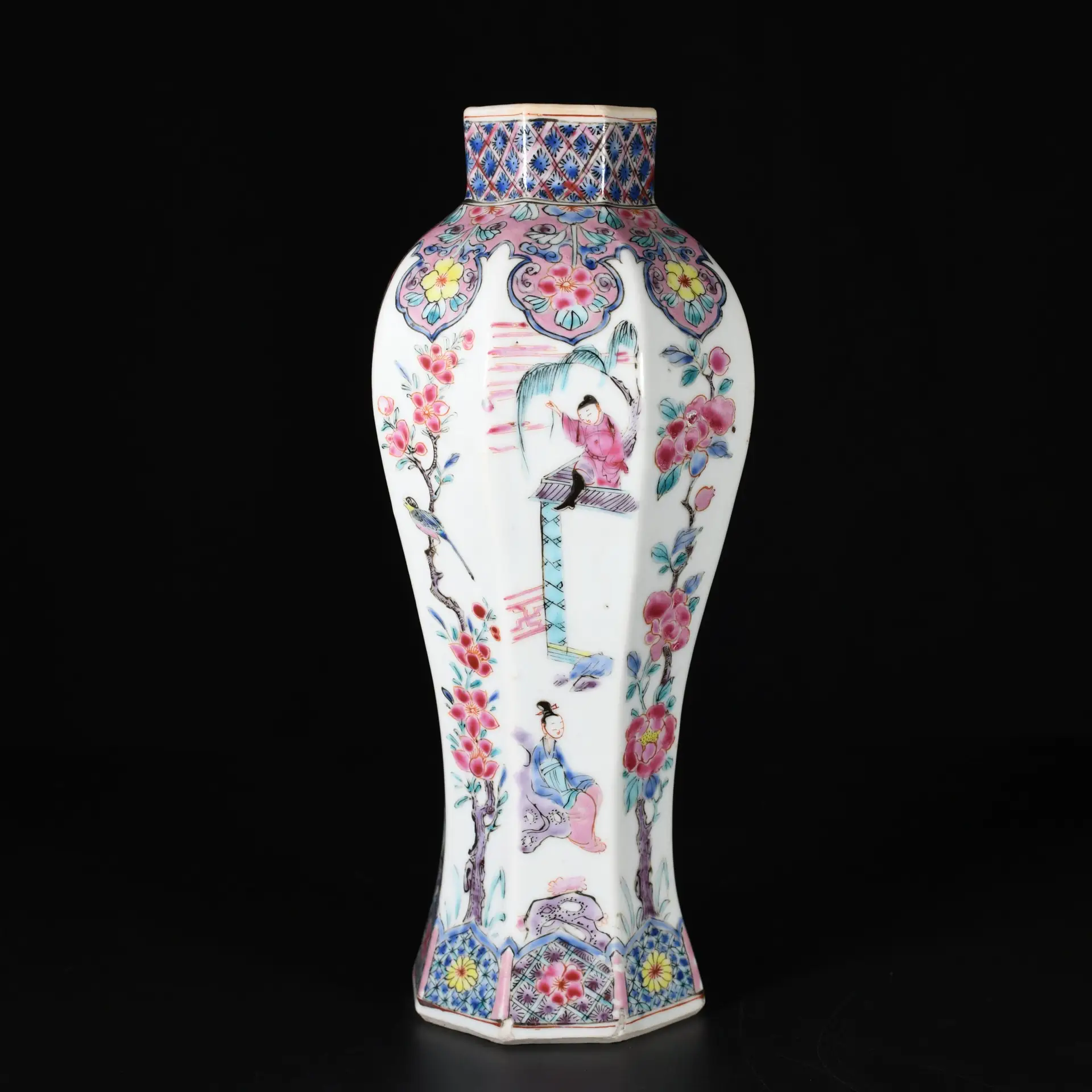 A rare hexagonal Famille Rose porcelain vase, decorated with two alternating scenes of figures, interspersed with two panels showing a bird perched on a flowering branch, while a fourth panel is decorated only with flowers. The neck and base are also adorned with geometric floral motifs.