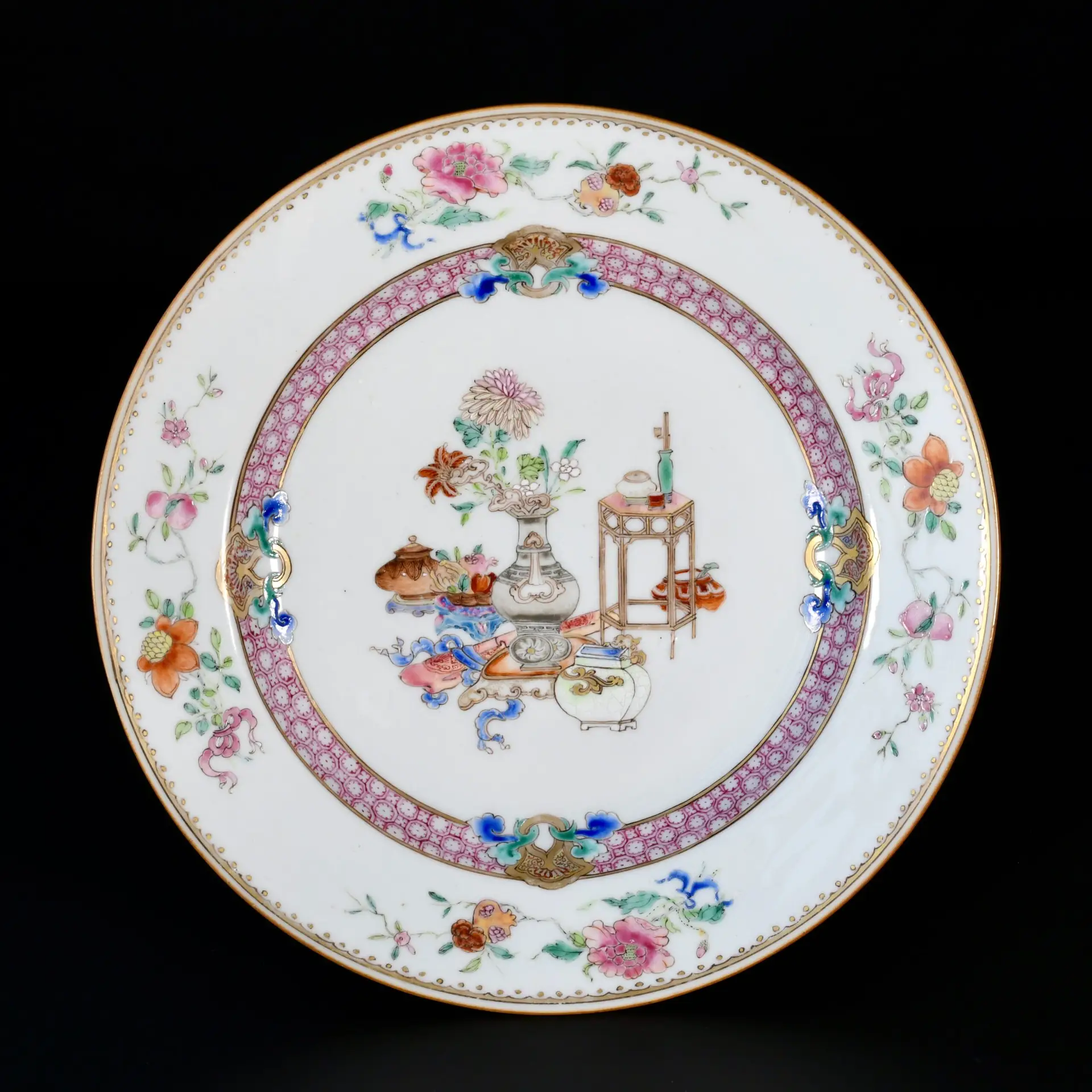 Assiette en porcelaine aux émaux de la Famille Rose à décor des « Cent Antiquités ».