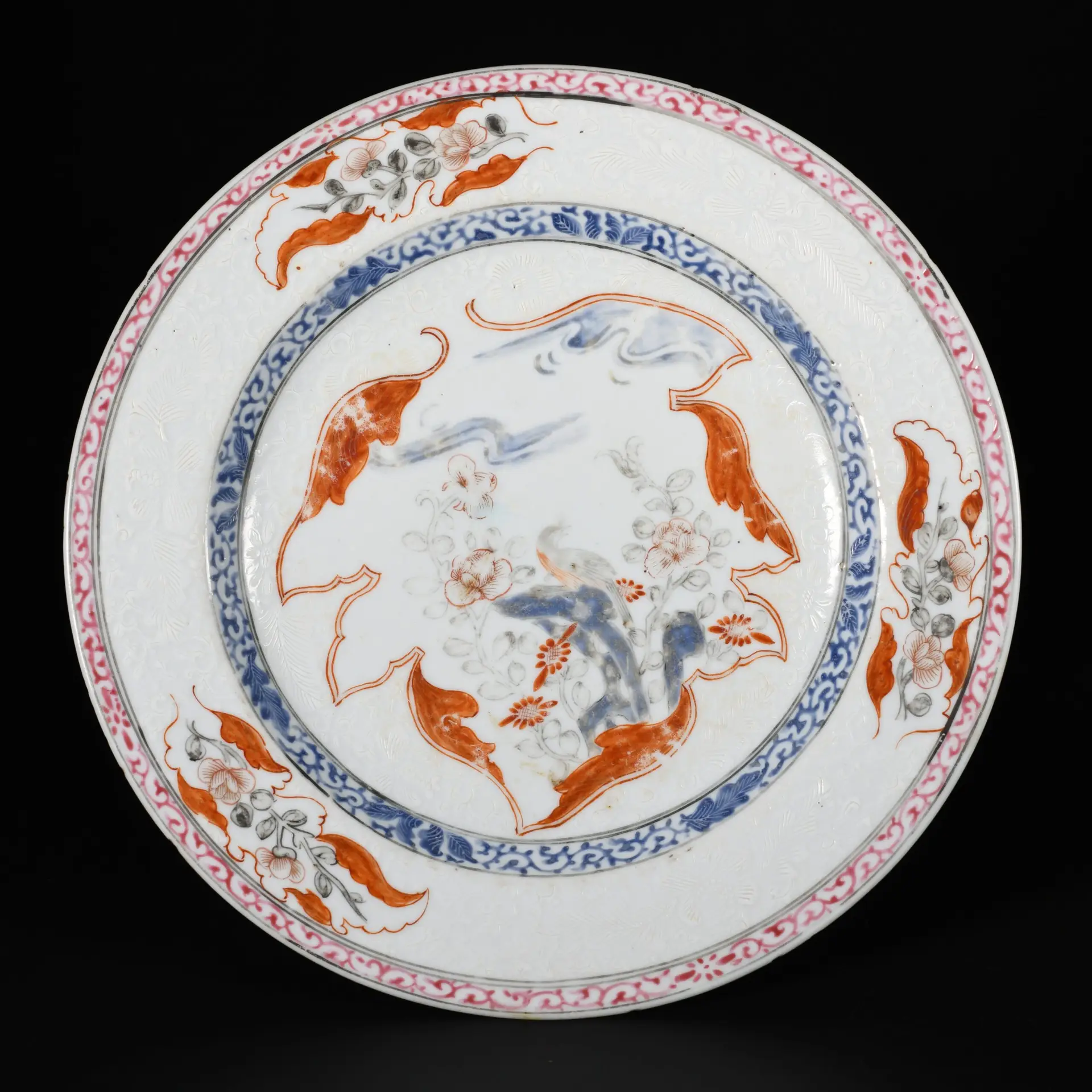 Rare assiette à décor dit « Bianco Sopra Bianco » d’un oiseau sur un rocher, dans un médaillon en forme de feuille. Le décor est répété en bordure.
