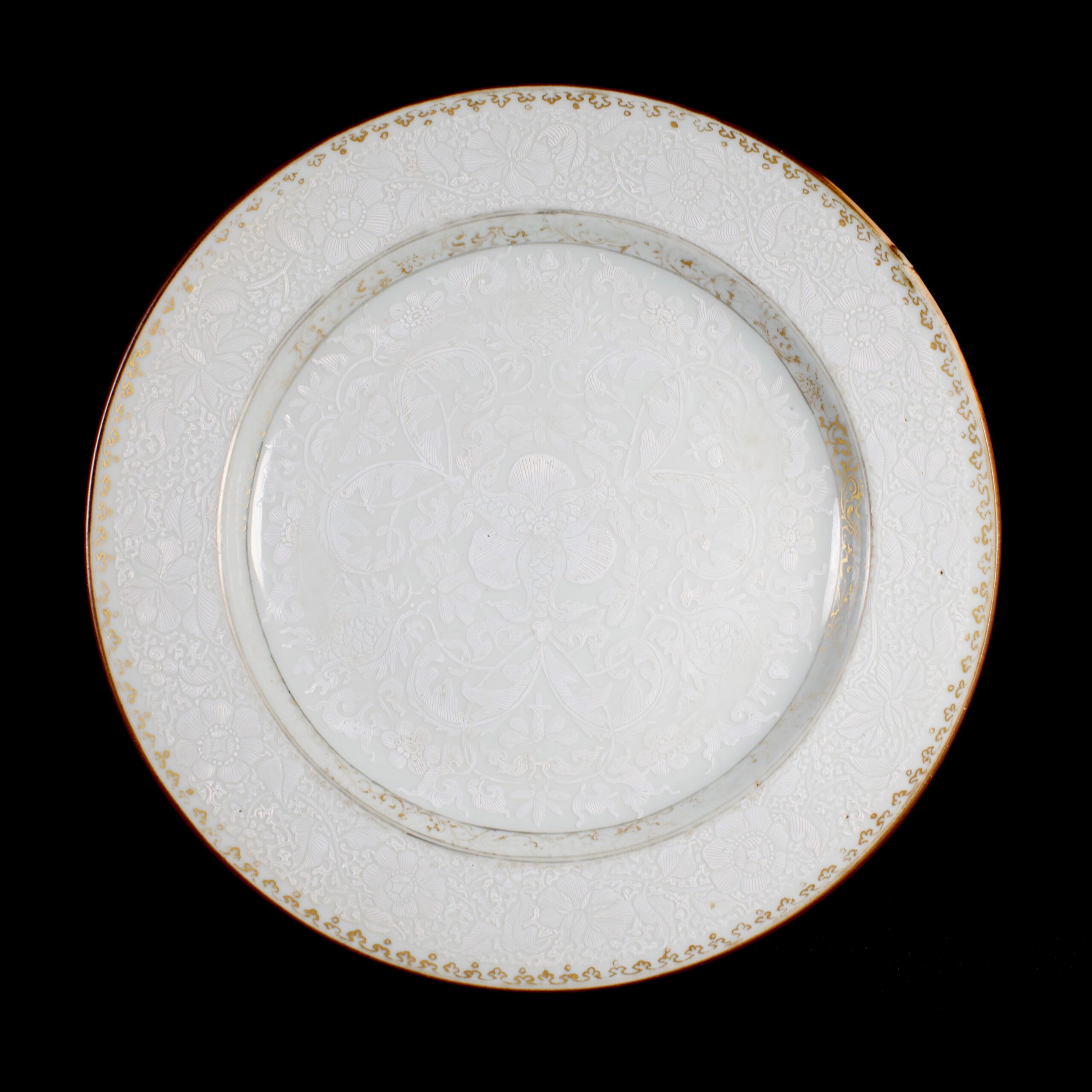 Assiette en porcelaine à décor en relief dit « Bianco sopra Bianco » de fleurs, papillons et au centre des poissons.