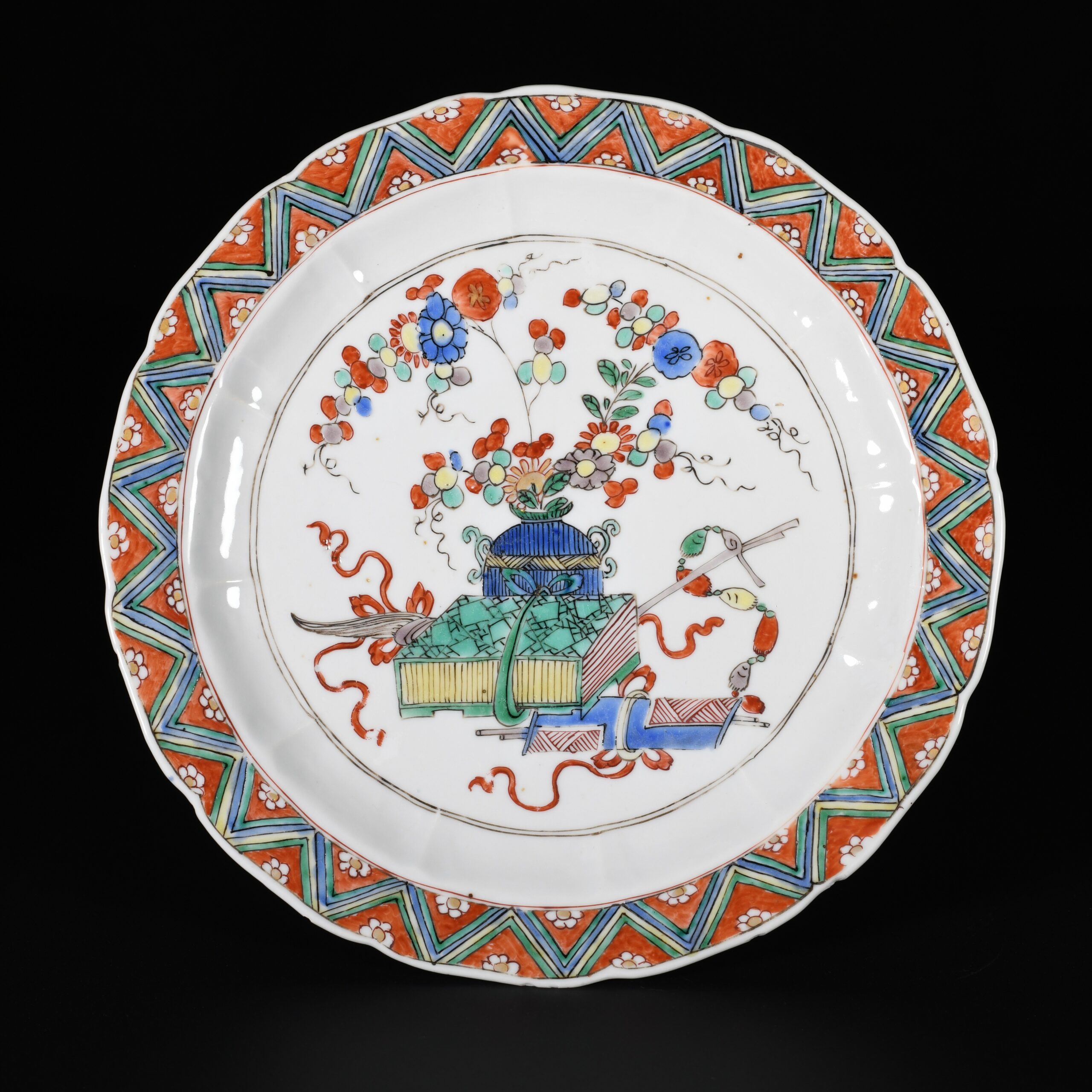 Assiette en porcelaine à bords lobés aux émaux de la Famille Verte, à décor central d’antiquités, d’objets précieux et de fleurs.
