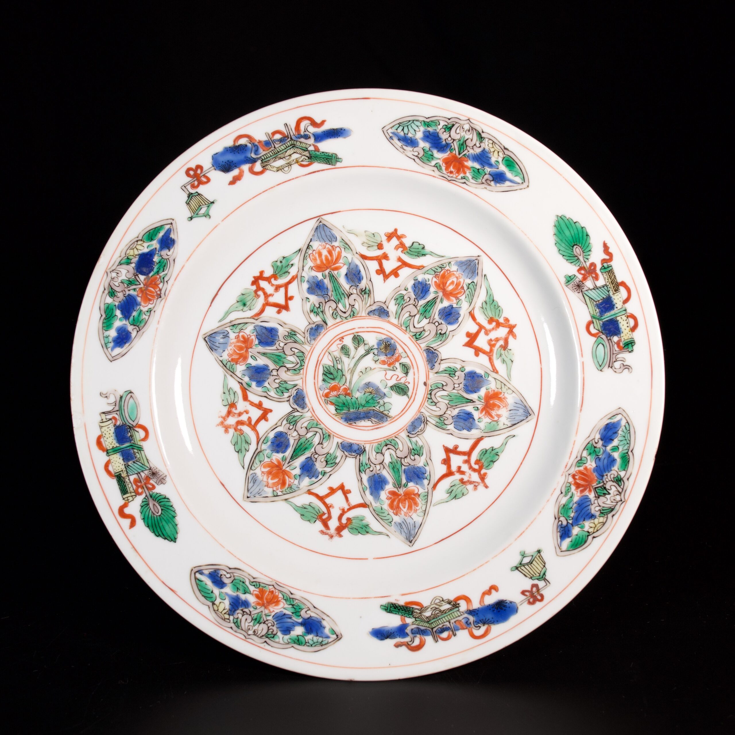 Assiette en porcelaine aux émaux de la Famille Verte à décor en bordure d’attributs bouddhistes, et de fleurs dans des cartouches, les émaux se rapprochent des émaux Wucai. Les couleurs sont vives, « Yingcai ».