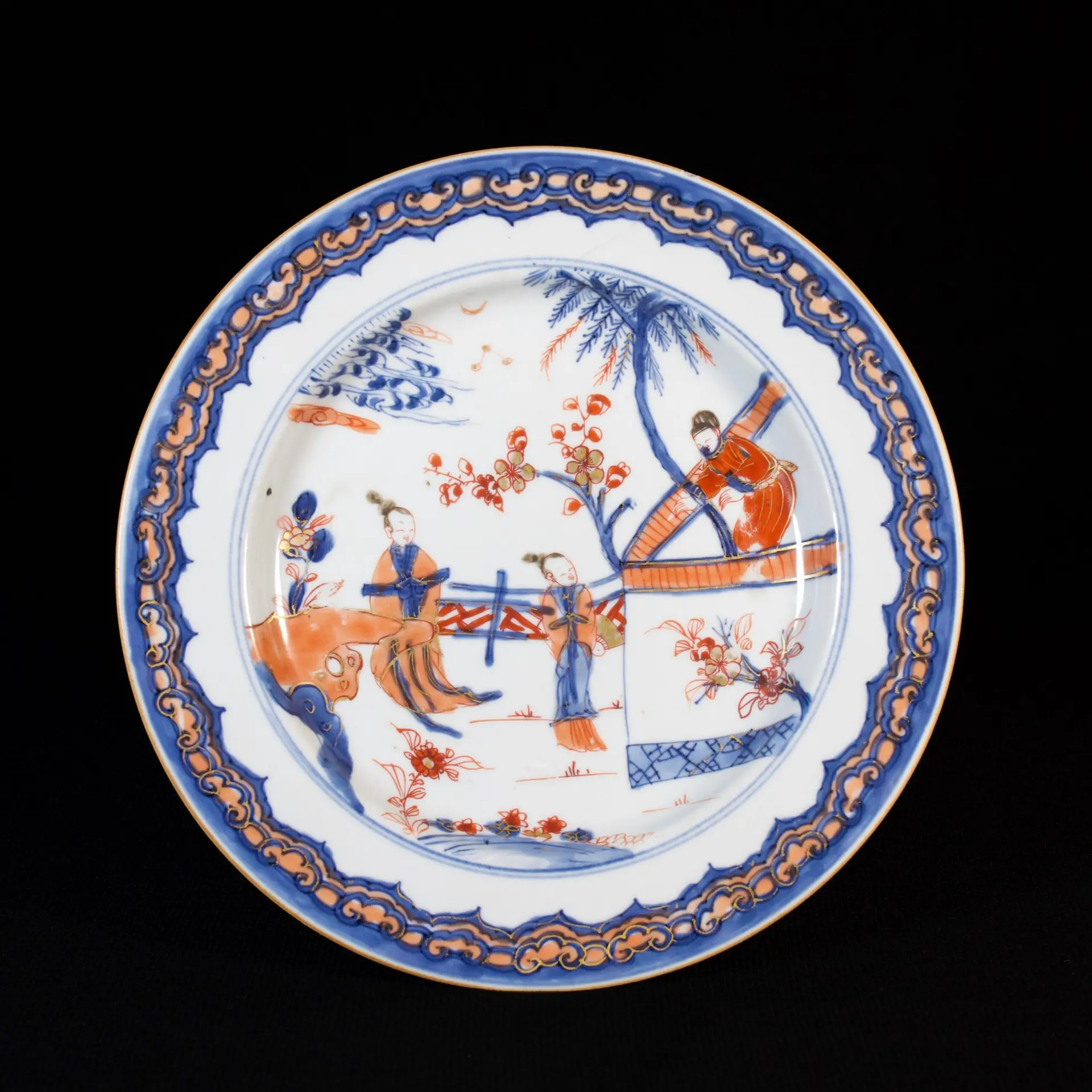Rare assiette en porcelaine à décor Imari de personnages dans le style de la Romance de la Chambre de l’Ouest.