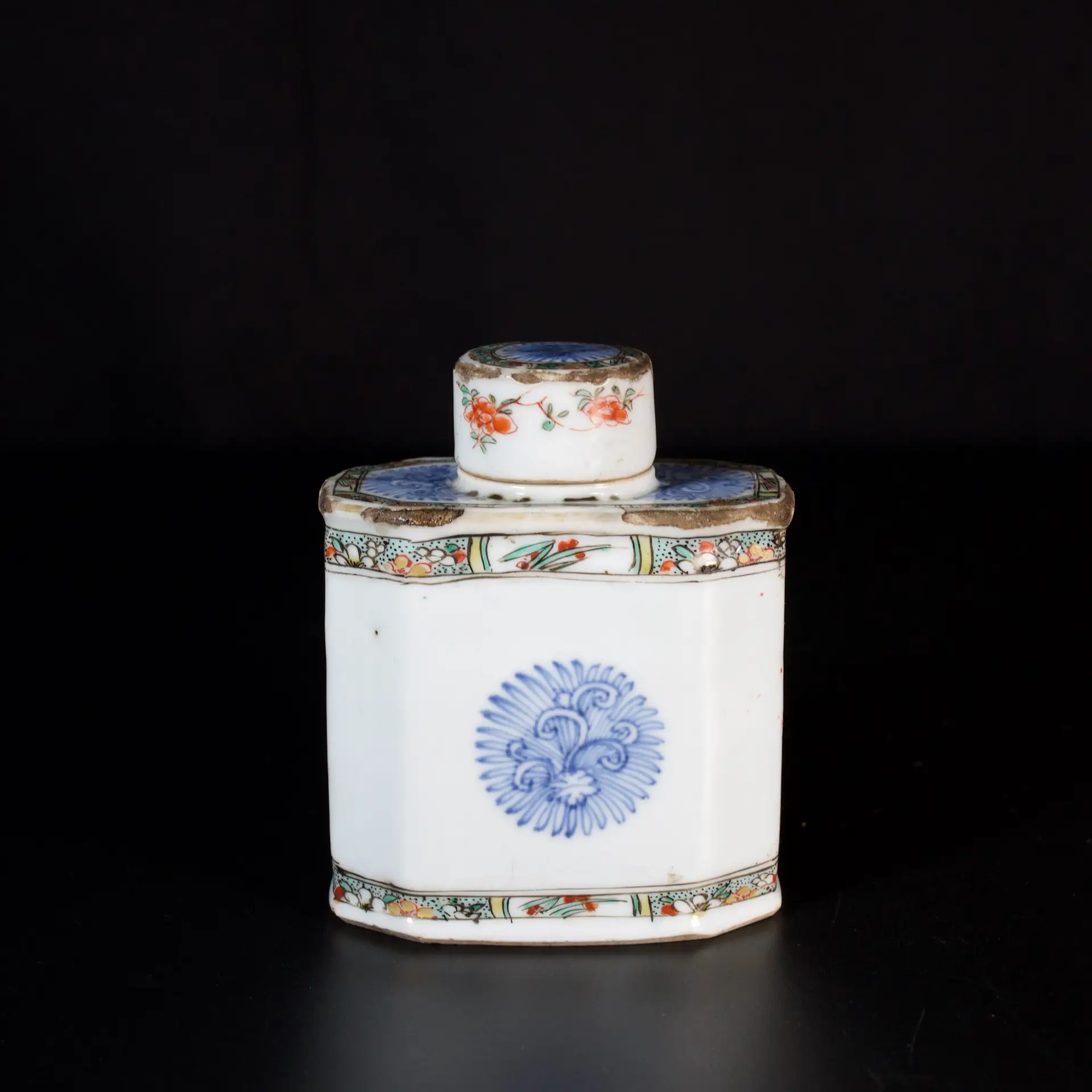 Boite à thé en porcelaine à décor en bleu sous couverte de ce qui pourrait être rapproché d’un symbole rappelant le soleil bouddhiste. Néanmoins, les symboles centraux font plutôt référence à des rinceaux. Le décor est répété sur toutes les faces de la boite. Le sommet du couvercle est décoré de frises aux émaux de la Famille Verte.