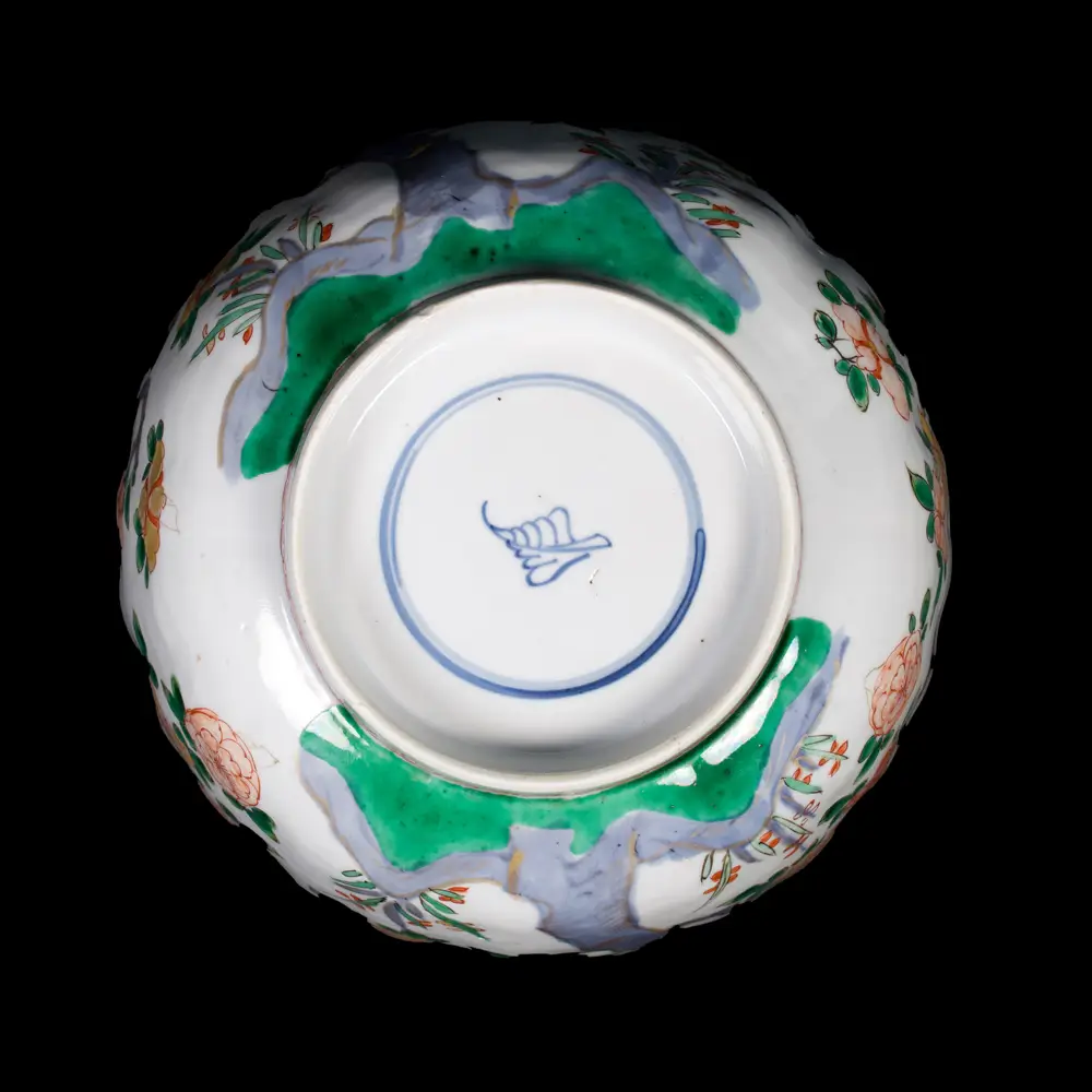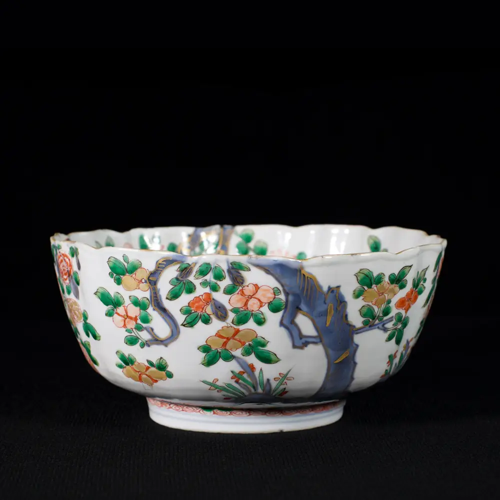 Bol cannelé aux émaux de la Famille Verte en porcelaine émaillé à décor d’arbres en fleurs à l’extérieur se prolongeant en bordure et à l’intérieur. L’intérieur est orné d’un médaillon central de panier de fleurs et de lingzhi.