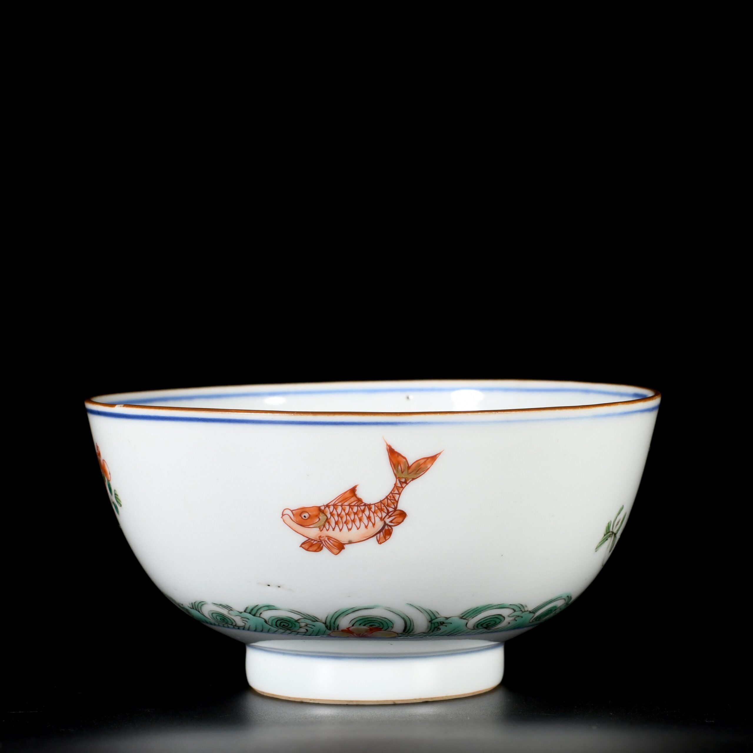 Bol en porcelaine aux émaux de la Famille Verte à décor de deux carpes. La mer est peinte en rouge de fer et or, reposant sur un liseré bleu.