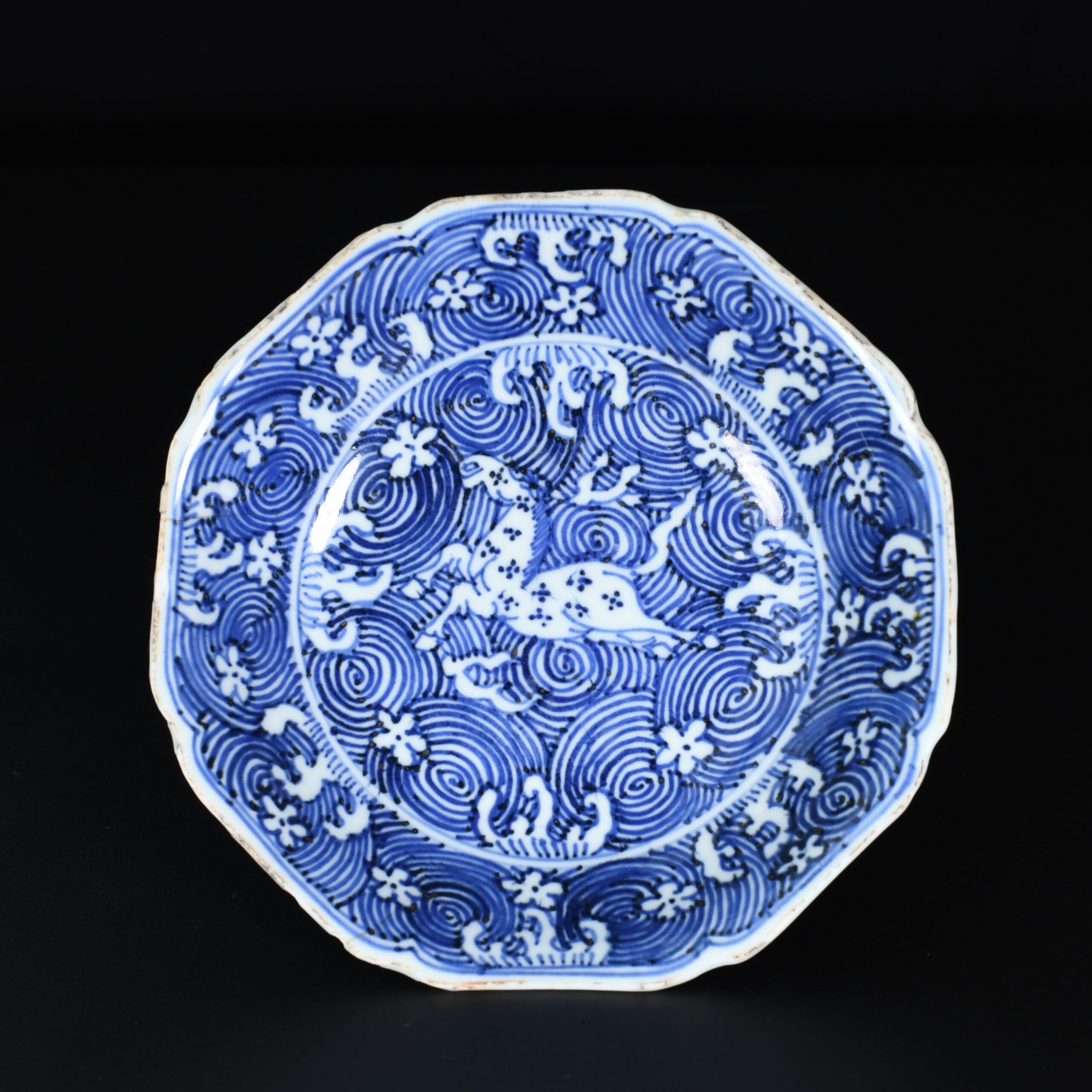 Petit plat en porcelaine à bord lobé, à décor bleu et blanc d’un cheval galopant dans les vagues, également décoré de prunus. Le décor de vagues est repris au revers.