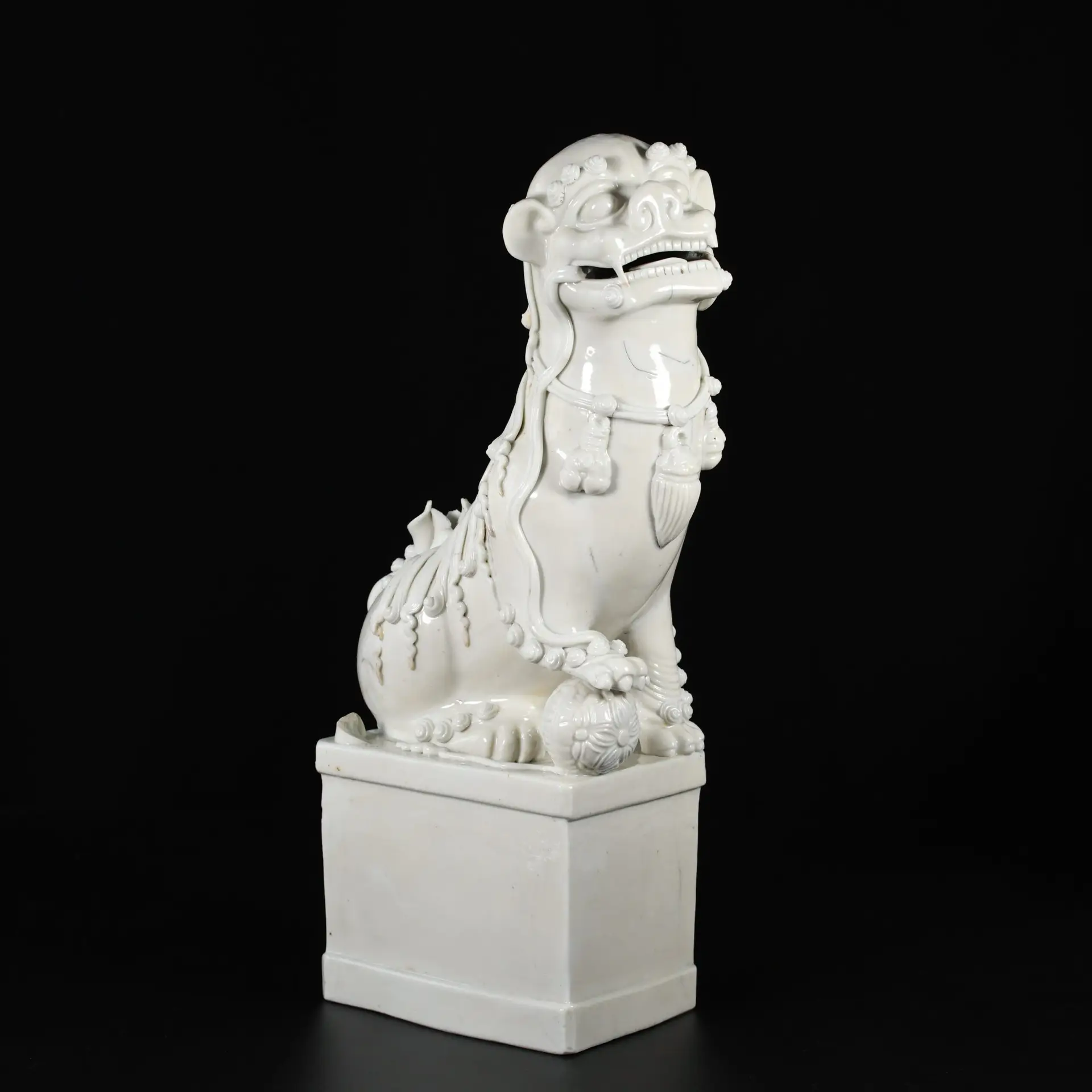 Un grand chien de Fo en porcelaine, d’une qualité extrêmement élevée. Il est rare de voir ce genre de figure aussi détaillée avec une pareil glaçure crème. On les voit couramment vers la fin du XVIIe puis sous Kangxi et tout le long de la Dynastie Qing. Ce chien de Fo est inhabituel, d’une part sa taille d’un peu plus de 34cm en fait un exemple particulièrement grand. Les éléments de son collier sont également extrêmement abouti. Tout les éléments en relief montre un soin énorme apporté à la réalisation de ce lion bouddhiques.