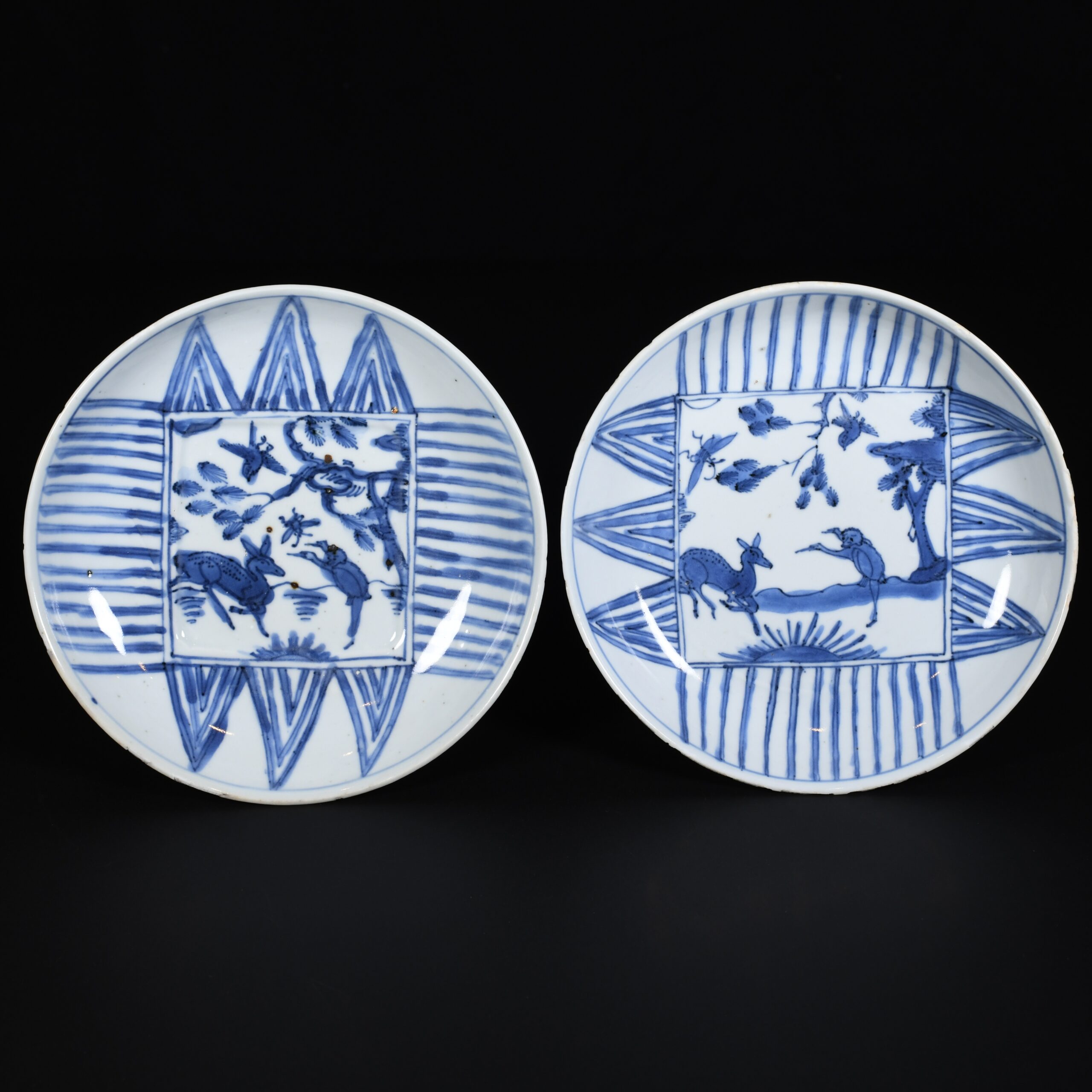 Paire de coupes en porcelaine à décor bleu et blanc d’un cerf, d’un singe et d’un oiseau en vol, près d’un pin.