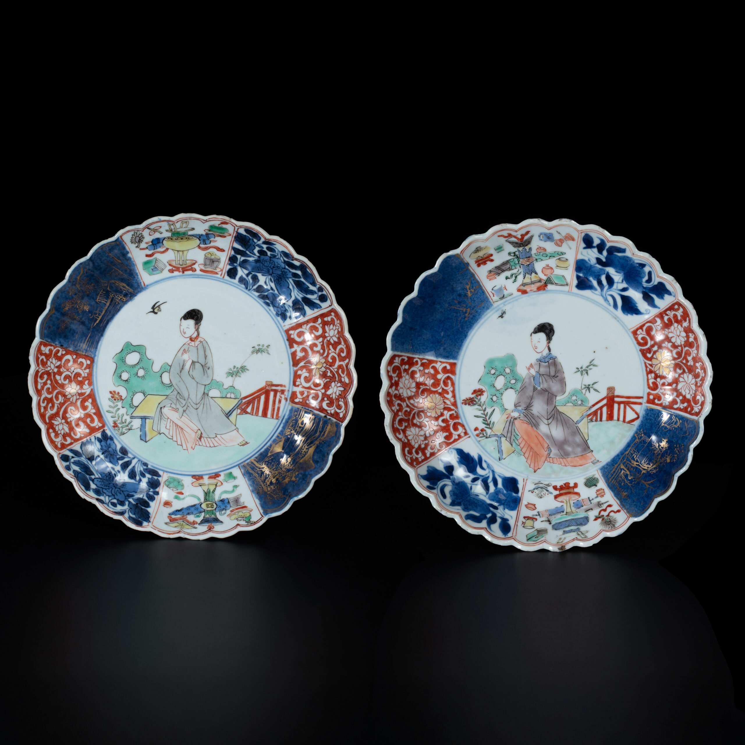 Deux coupes polylobées aux émaux de la Famille Verte représentant une femme sur un balcon.