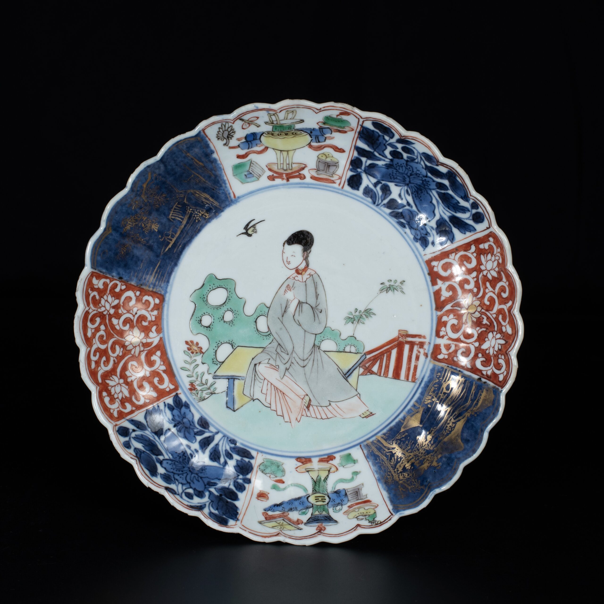On observe ici un mélange de styles, le décor central est réalisé dans les émaux de la Famille Verte, et on retrouve en bordure un décor bleu poudré, mais aussi rouge de fer, alterné avec un décor Famille Verte d’objets précieux.
