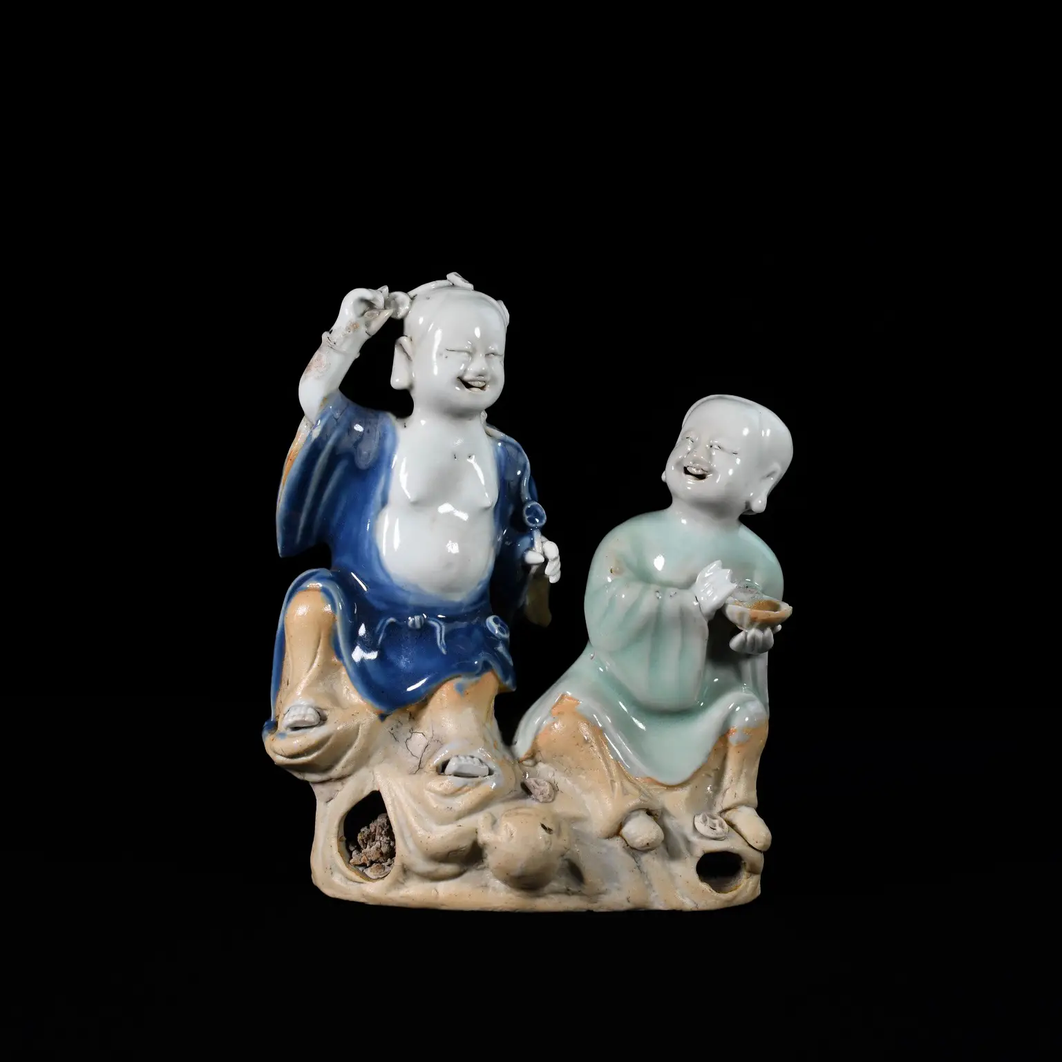 Groupe en porcelaine aux émaux celadon, blanc et bleu représentant les Hehe Erxian. La base ainsi que les jambes des personnages sont non émaillée. Il est rare de trouver cette représentation avec des émaux similaires.