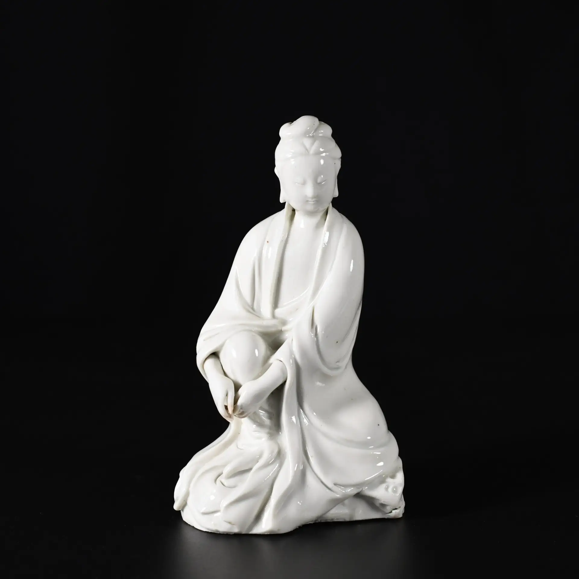 Cette Guanyin est d’une grande qualité, et rassemble les caractéristiques d’une belle figure de Dehua. La figure est représentée particulièrement apaisée, dans un style assez réaliste et simple, les cheveux sont noués, sans coiffe. Les mains sont particulièrement abouties et on distingue la finesse des doigts. La glaçure est blanc crème.