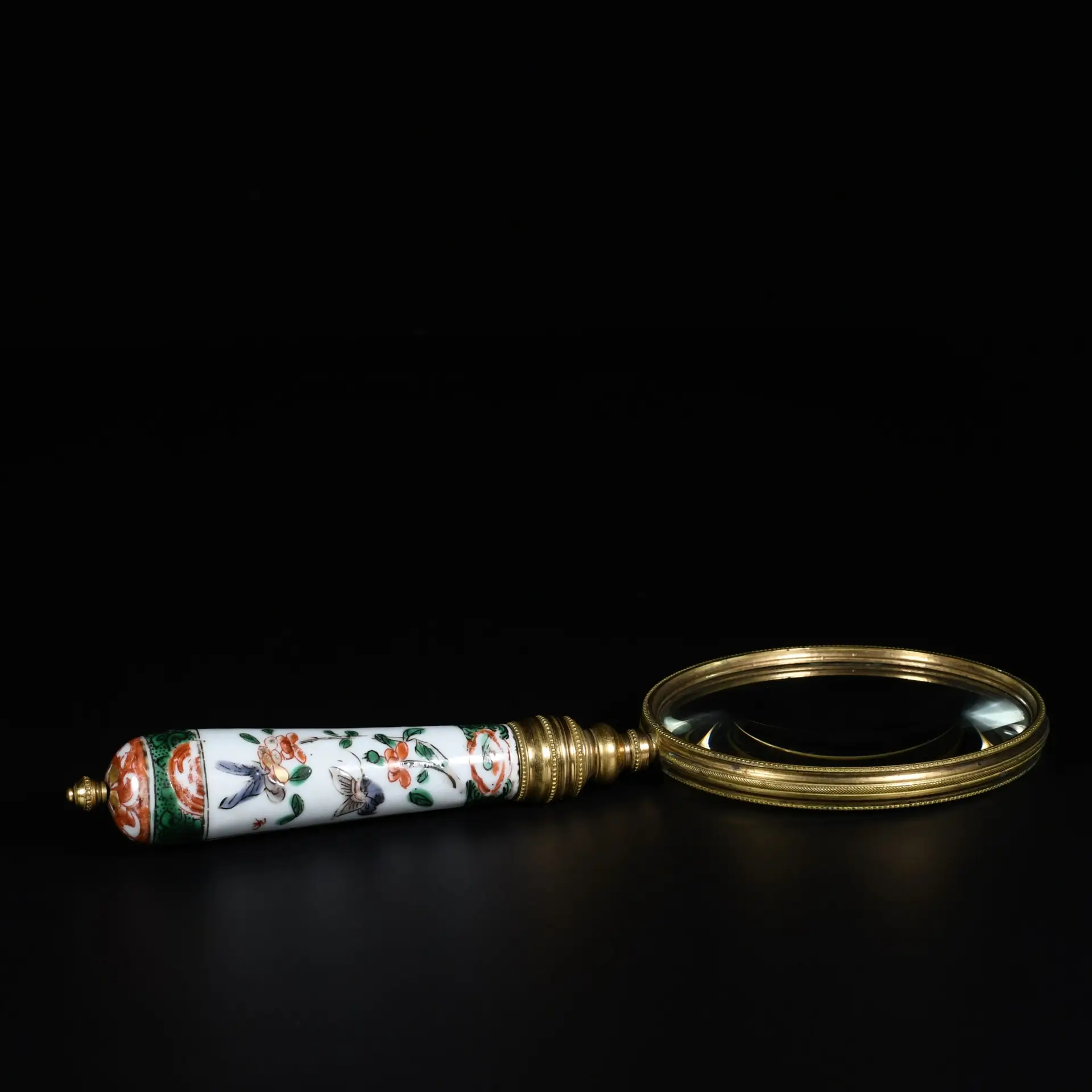 Loupe en porcelaine, le manche décoré dans les émaux de la Famille Verte, d’oiseaux, de papillons et de fleurs. La porcelaine a été adapté avec une monture en métal doré.