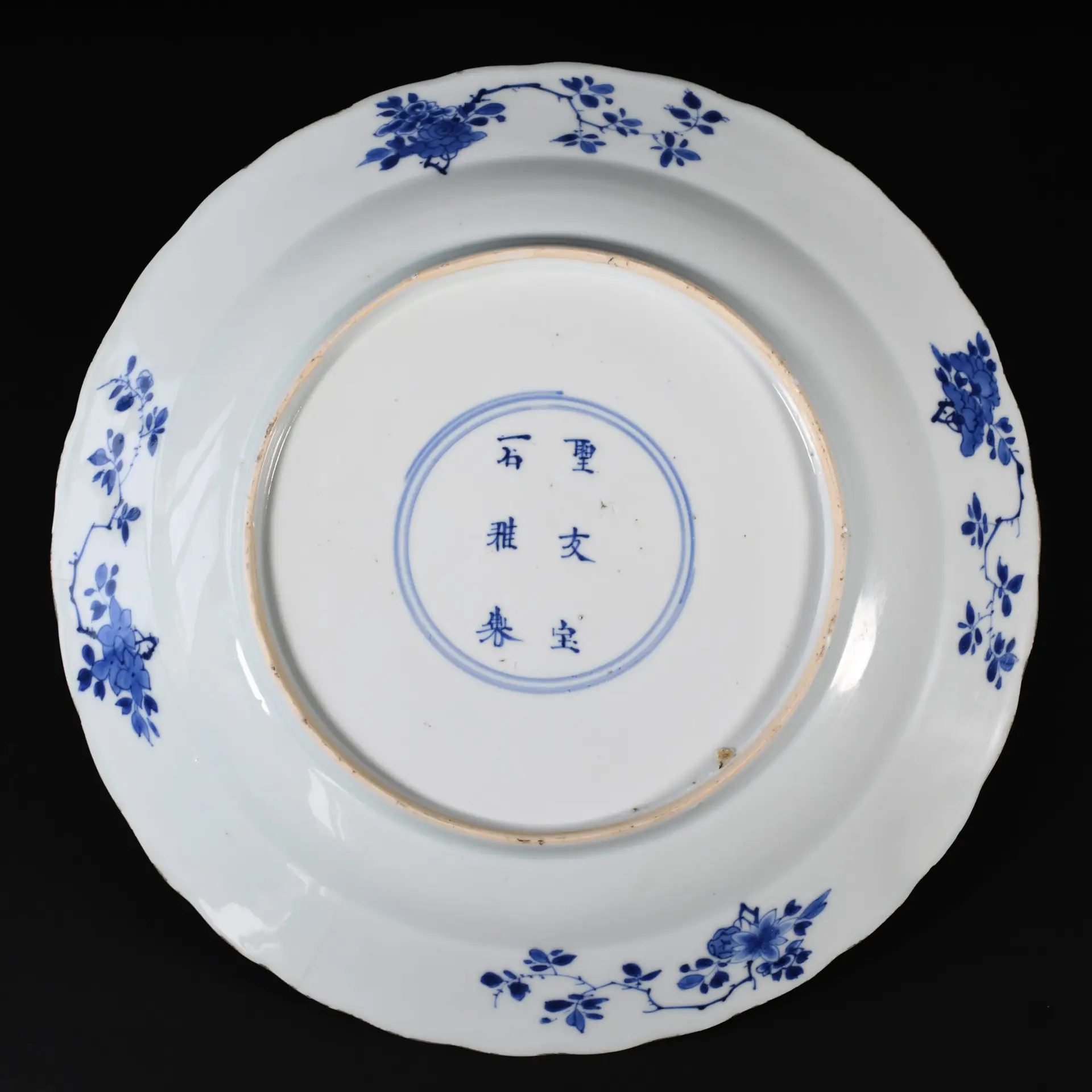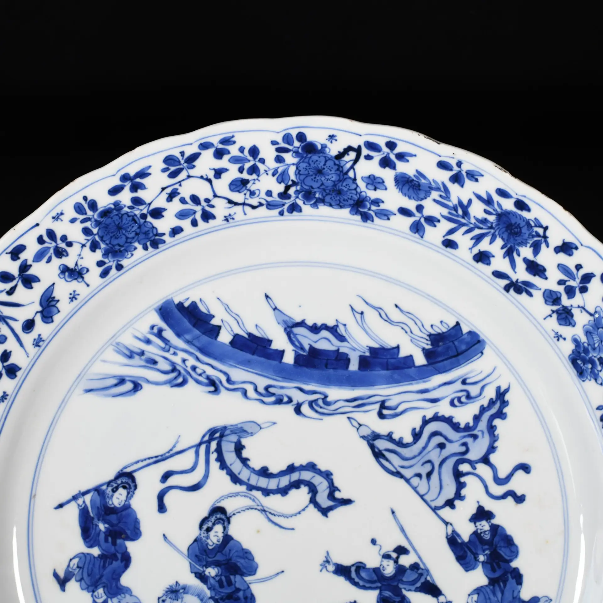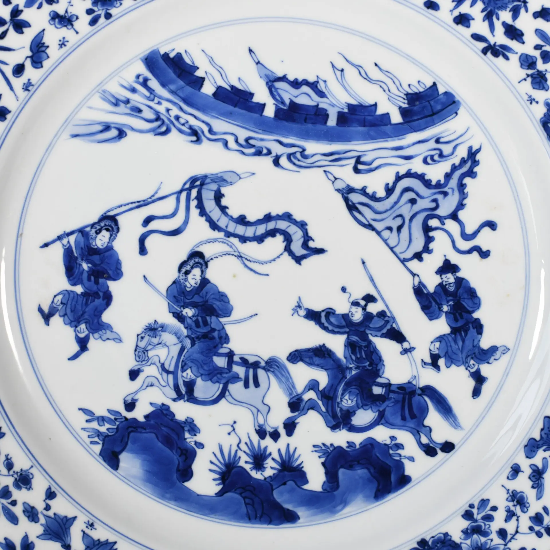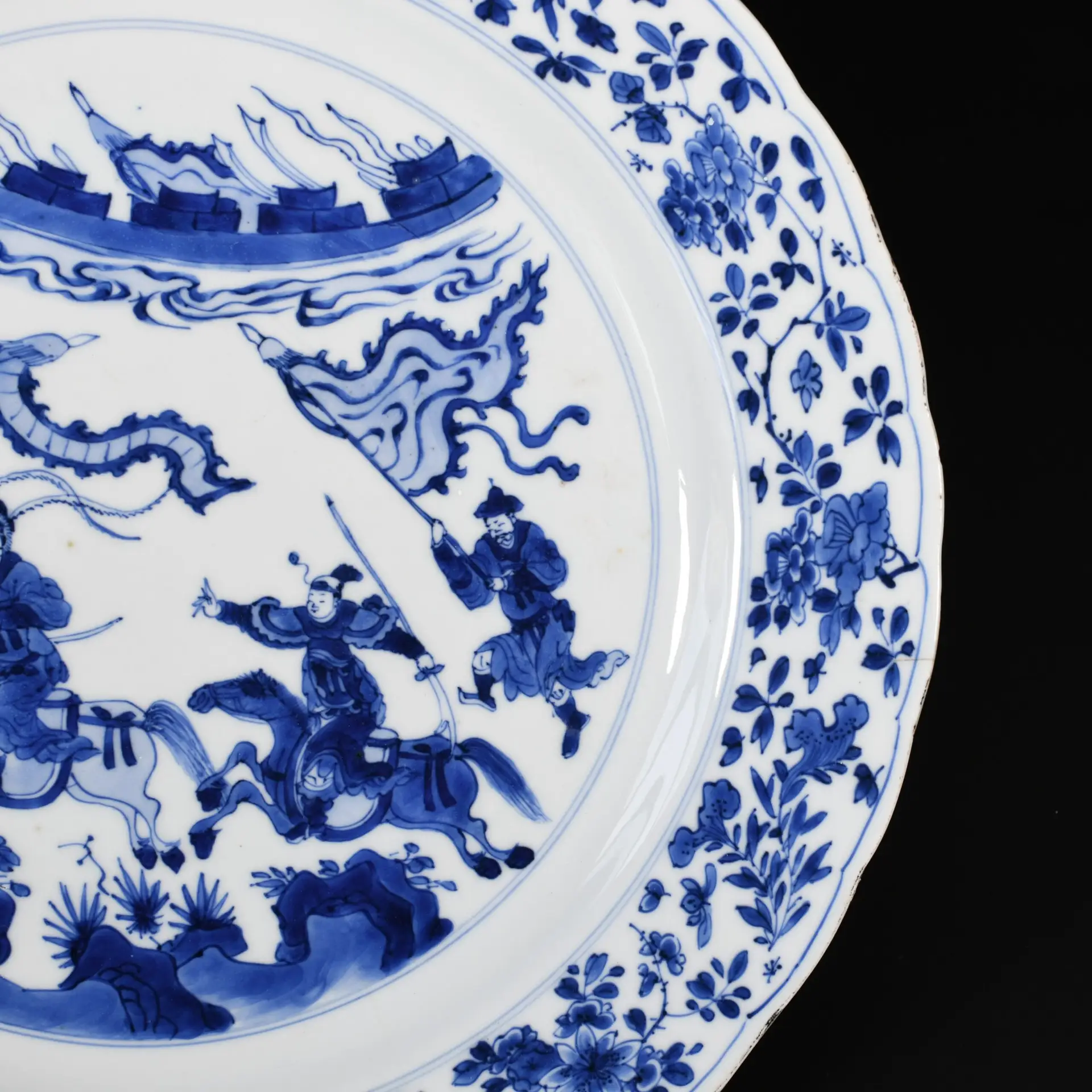Grand plat en porcelaine à bord lobé, à décor central bleu et blanc de de deux cavaliers et de deux porte-étendards. Le fond de la scène centrale montre une muraille.