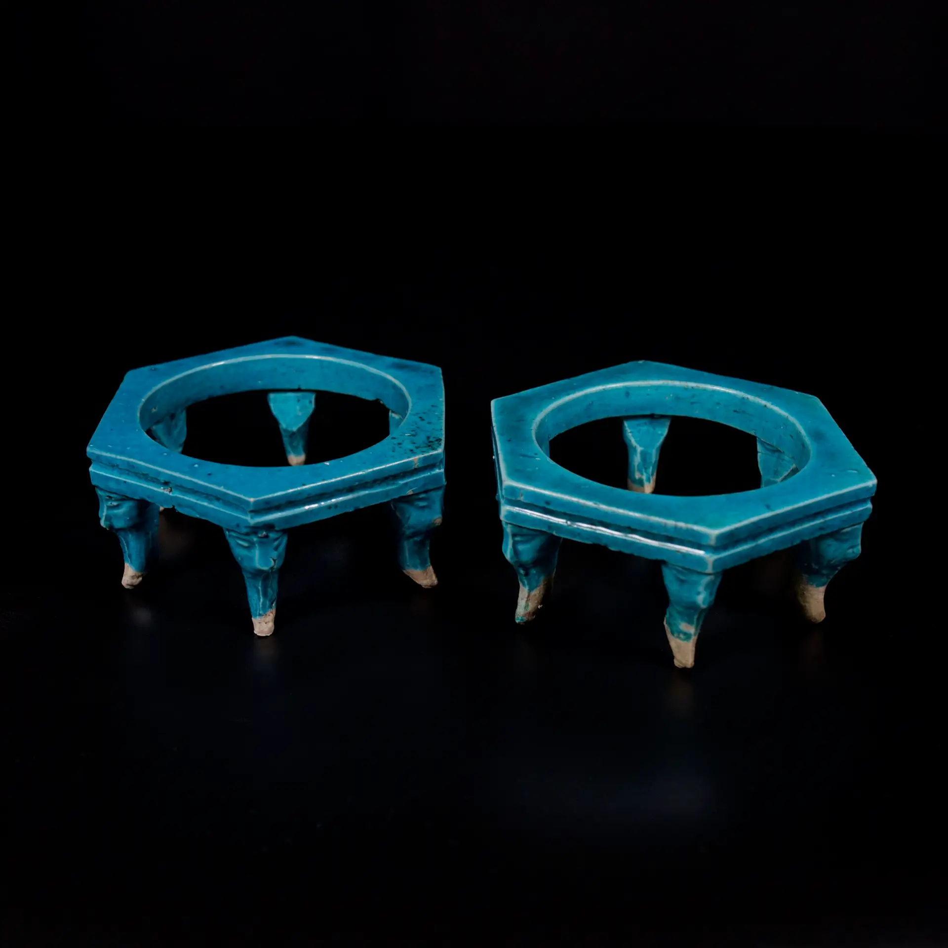 Deux supports en porcelaine de forme hexagonale. Ils reposent sur six pieds, le haut des pieds formant des masques de Taotie et leur base des griffes. Le biscuit est recouvert d’une glaçure turquoise recouvrant l’ensemble du support à l’exception néanmoins de la base des pieds.