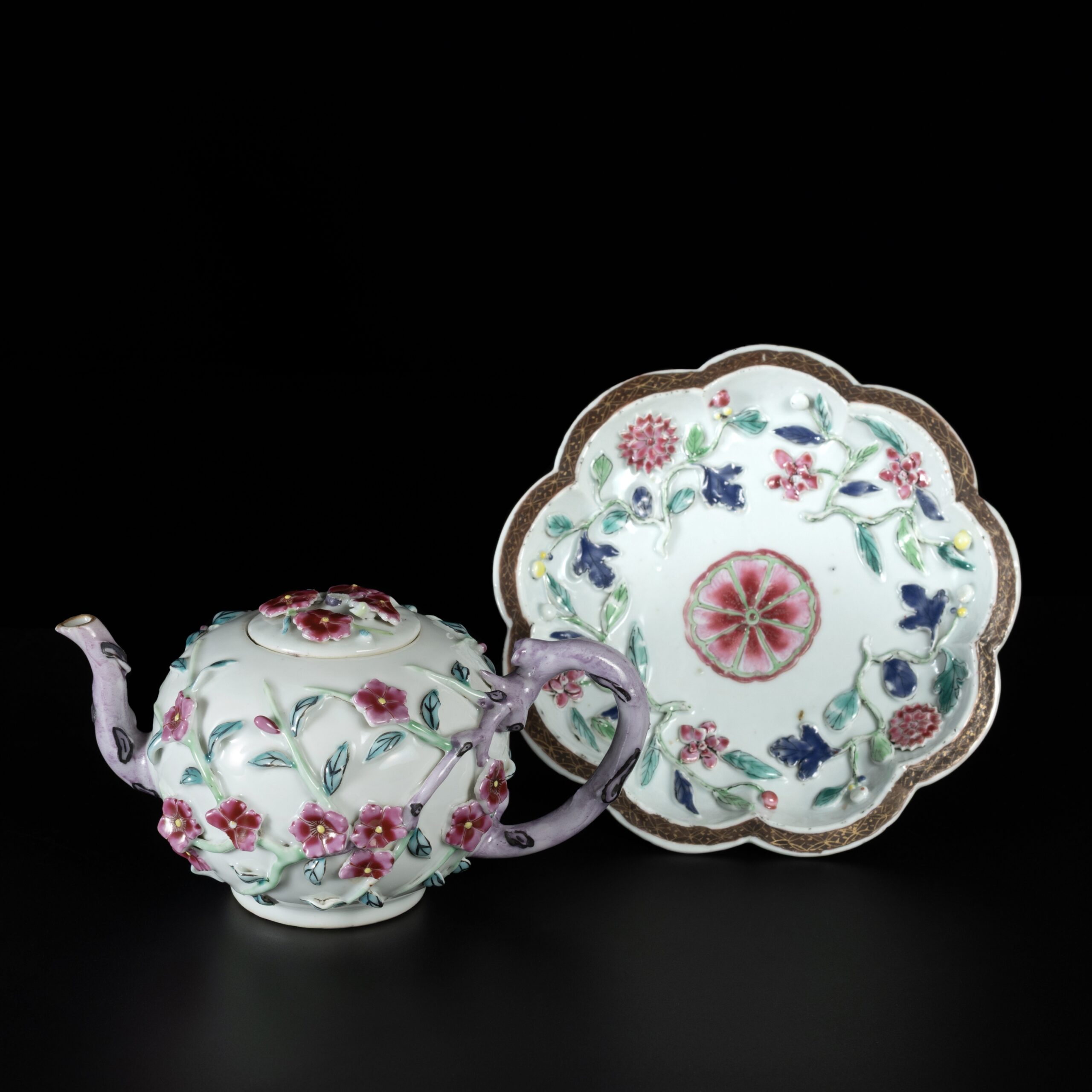 Théière en porcelaine aux émaux de la Famille Rose à décor de fleurs en relief. L’anse et le bec de couleur violacée sont faits de manière à imiter une branche d’arbre. Elle est accompagnée de son pattipan.