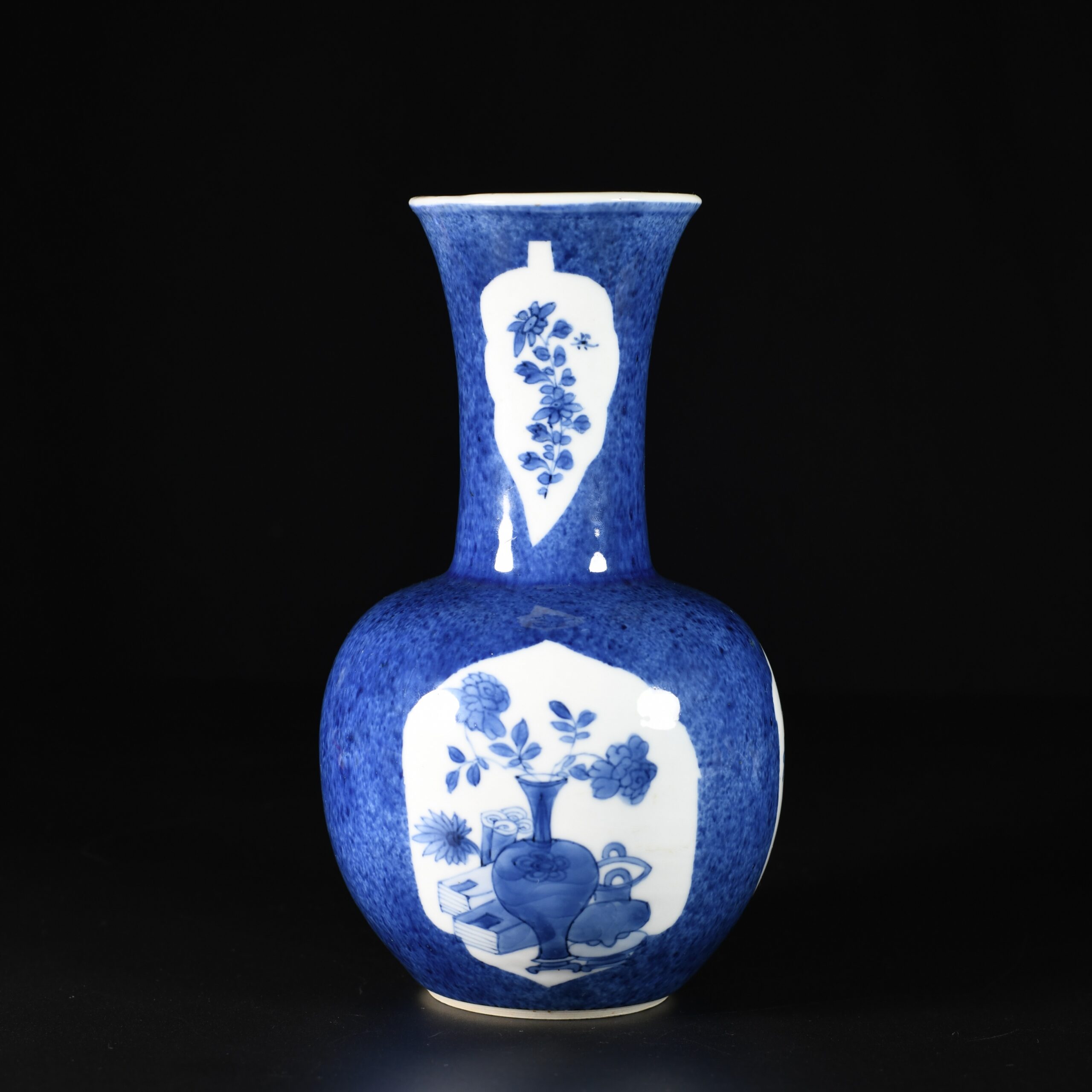 Vase en porcelaine de forme bouteille à décor bleu poudré décoré de trois cartouches à décor de vases fleuris sur un fond bleu poudrés, la partie supérieure du vase est décoré de fleurs dans des cartouches en forme de feuille.